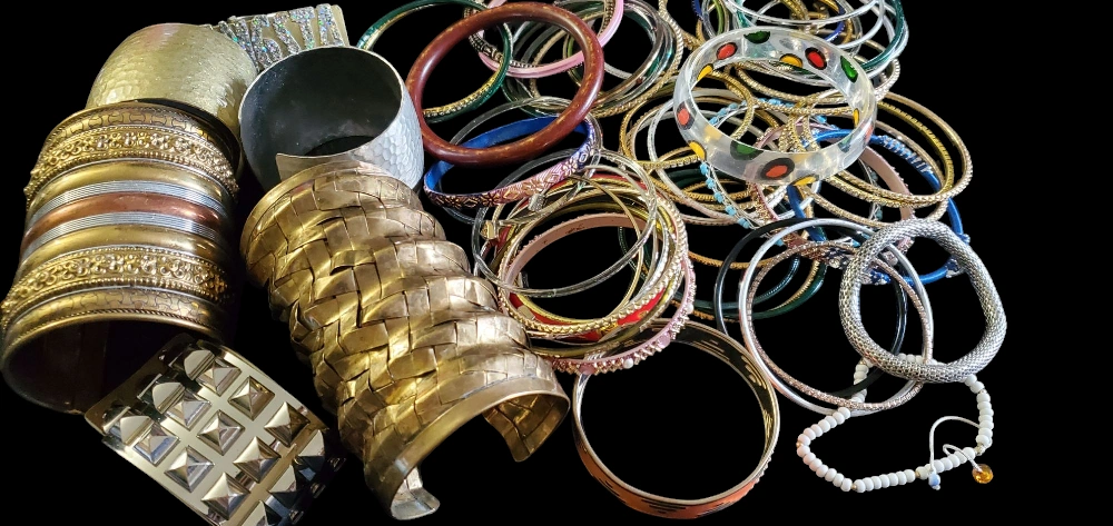 Large collection of bangles and cuffs. Various colours, materials, and styles. Perfect for layering or gifting. Some show minor wear.