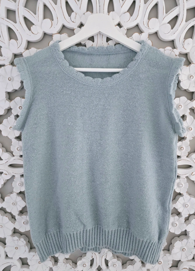 New with tag Women's light blue sleeveless knit sweater vest. Relaxed fit. Ribbed hem. Slightly frayed edges. Perfect for layering. Size: 47cm shoulder x 110cm chest x 59cm length.