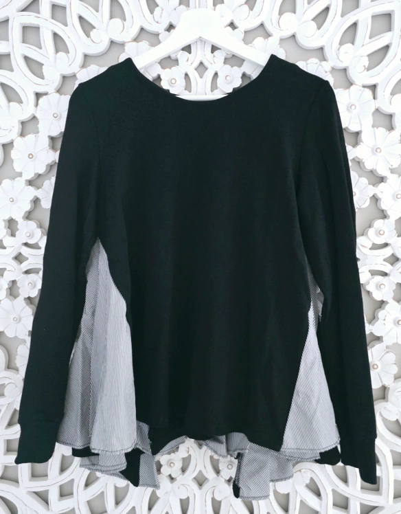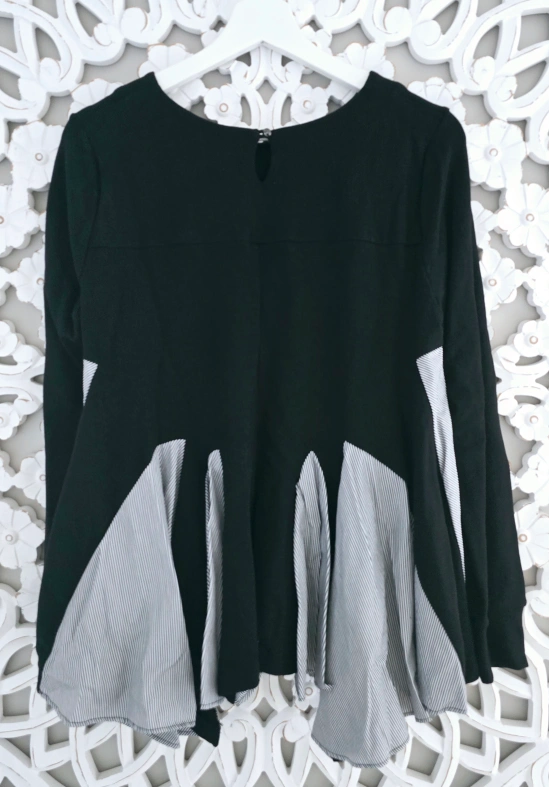 New with tag Long sleeve top. Black and grey striped detailing. Unique asymmetrical design. Relaxed fit.