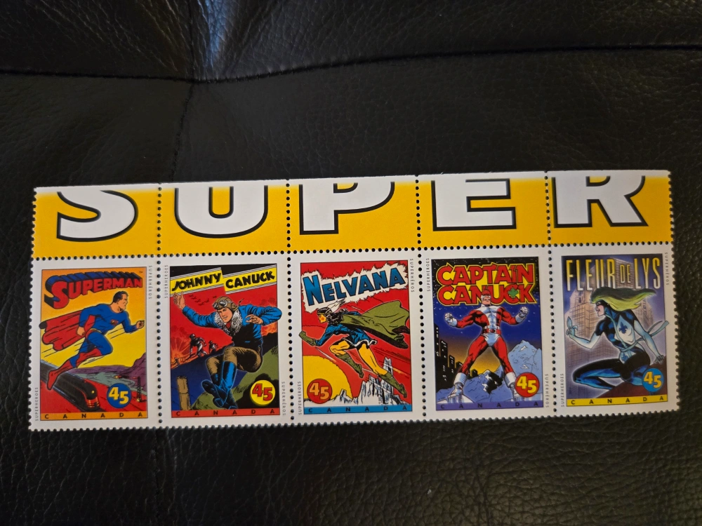 Set of five 45-cent Canadian stamps. Features Superman, Johnny Canuck, Nelvana, Captain Canuck, and Fleur-de-Lys. Collectible stamps, great for philatelists.