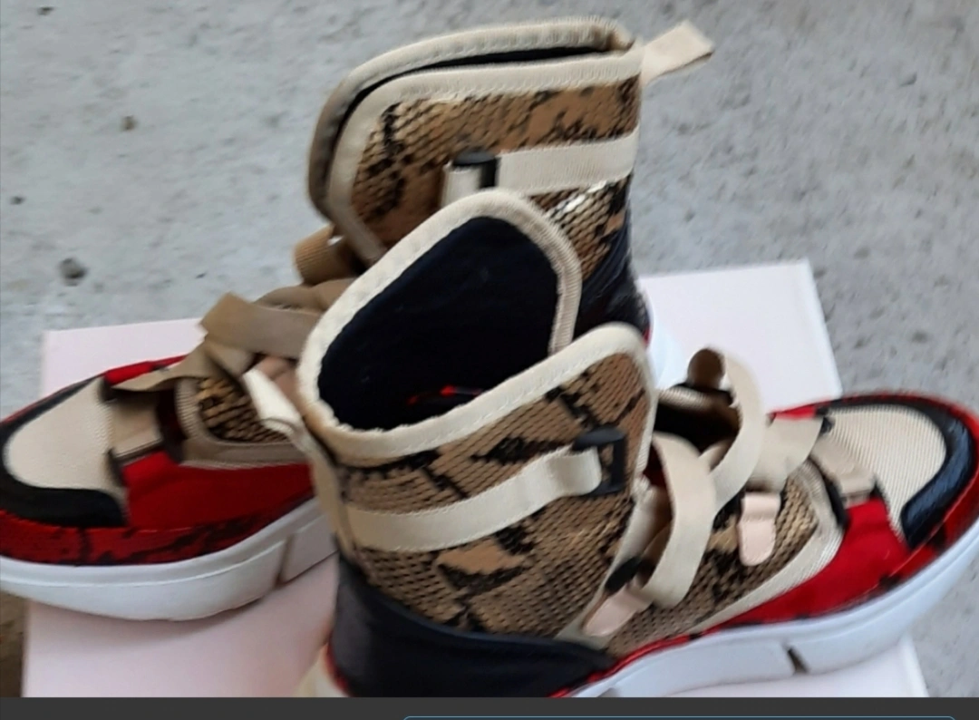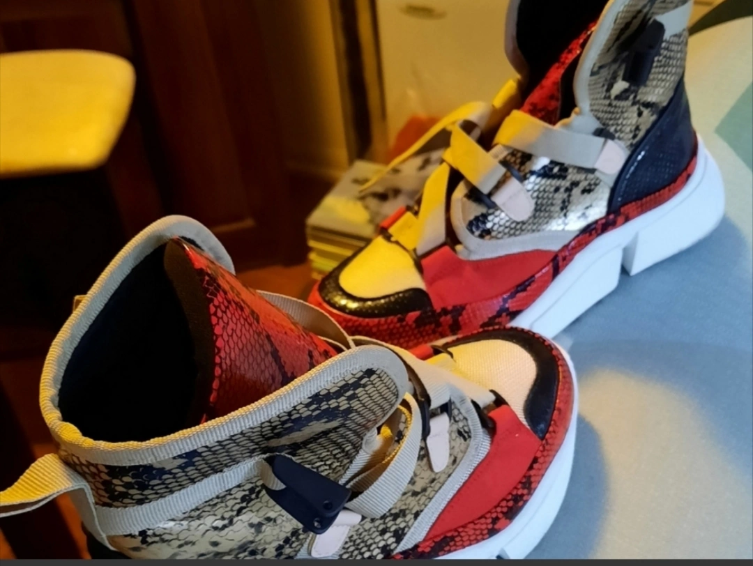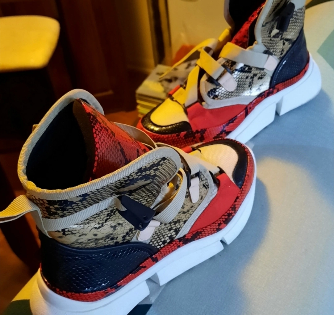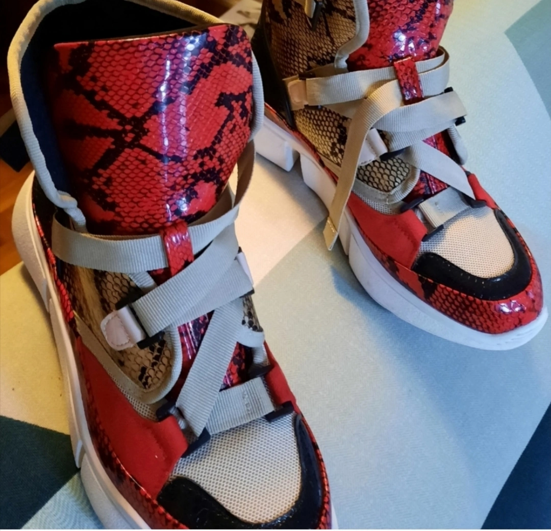 Stylish high-top sneakers. Red, beige, and black snakeskin pattern. Unique design. Comfortable chunky sole. Great for everyday wear or a night out. please note that one buckle damage but it can wear without the buckle.