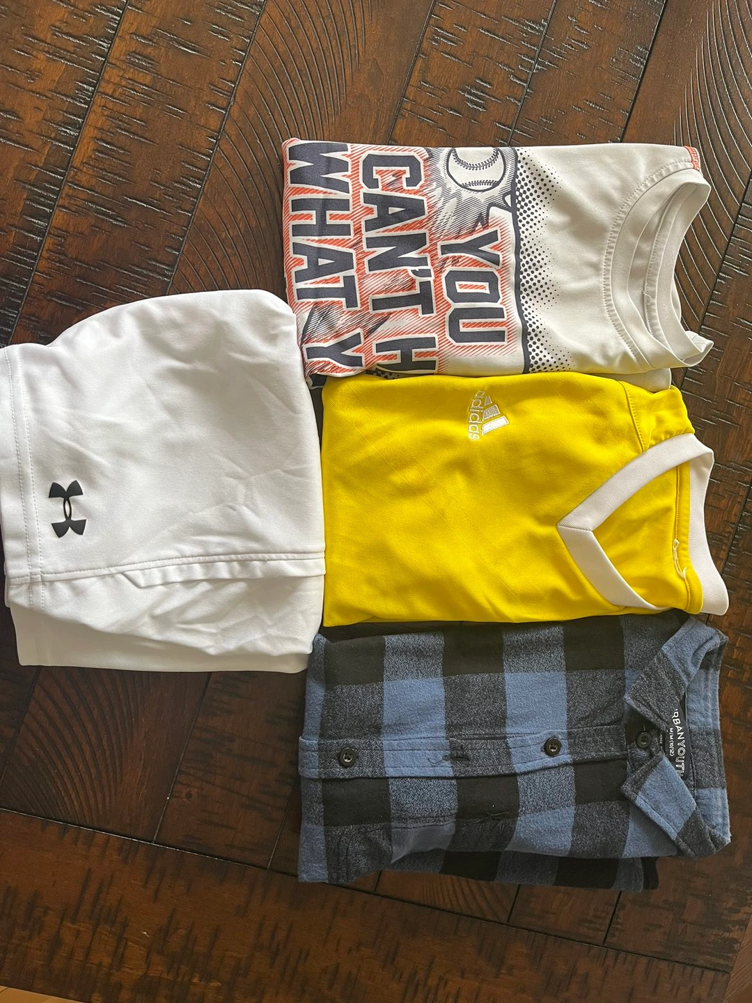 gently used all for 8$ age 10/12 addias shirt dry (fit ) under armour shorts (dry fit) urban youth shirt oshkosh dry fit shirt freshly washed in a very good condition from smoke and pet free home
