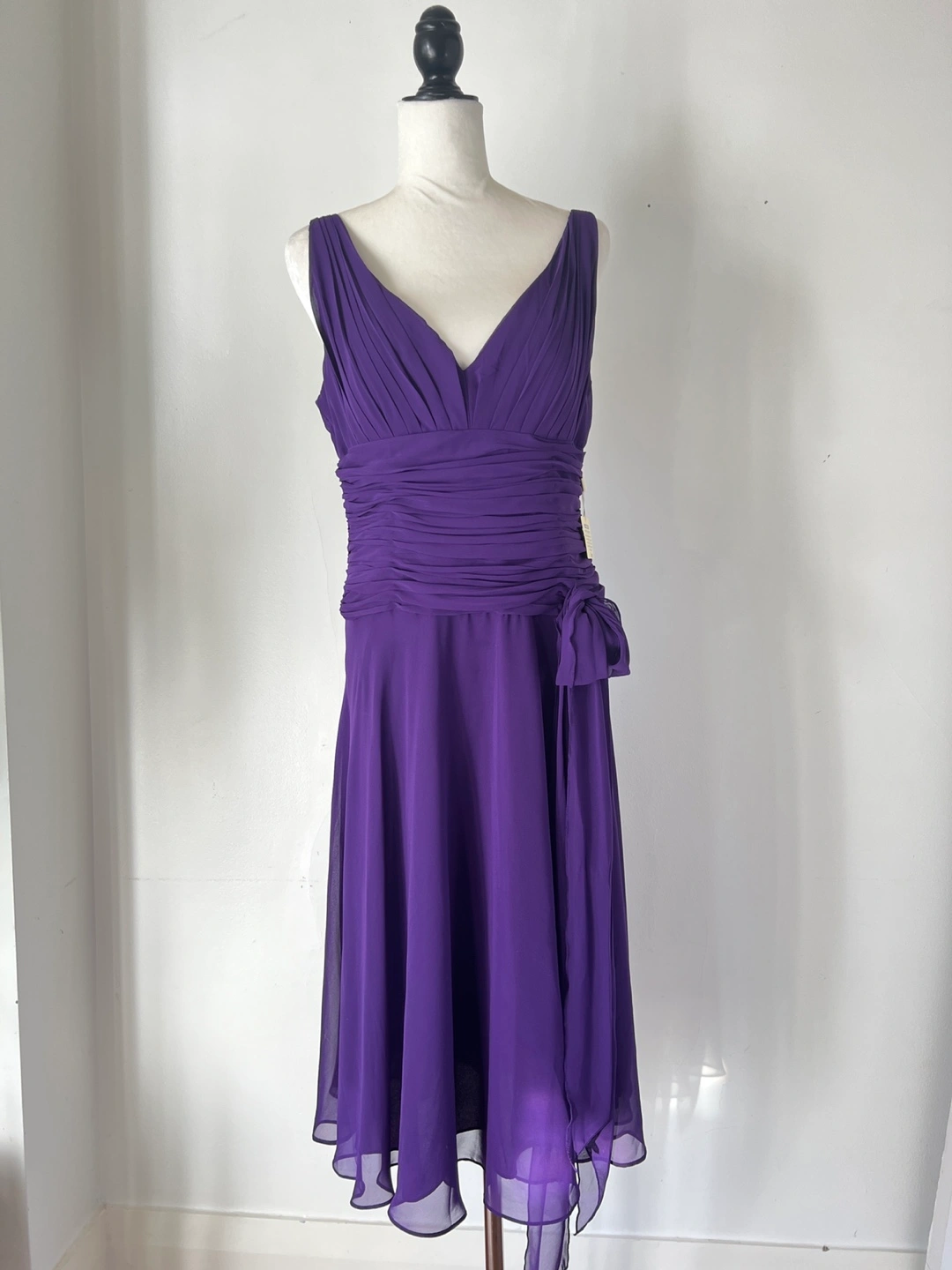 Beautiful purple dress. A-line silhouette. V-neck. Back zipper. Ruched bodice. Flowy skirt. Side bow detail. Looks great for a wedding, prom or other special occasion.