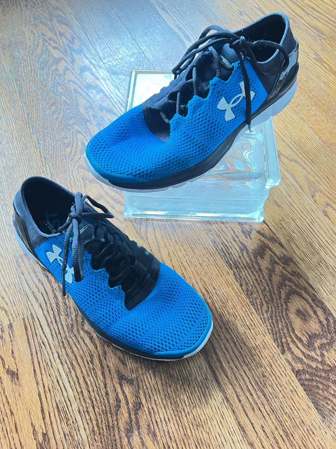 Pre-owned Under Armour running shoes. Blue and black colour scheme. Lace-up closure. Good for workouts or casual wear. Great condition other than a few scratches on the plastic on side (see photos).