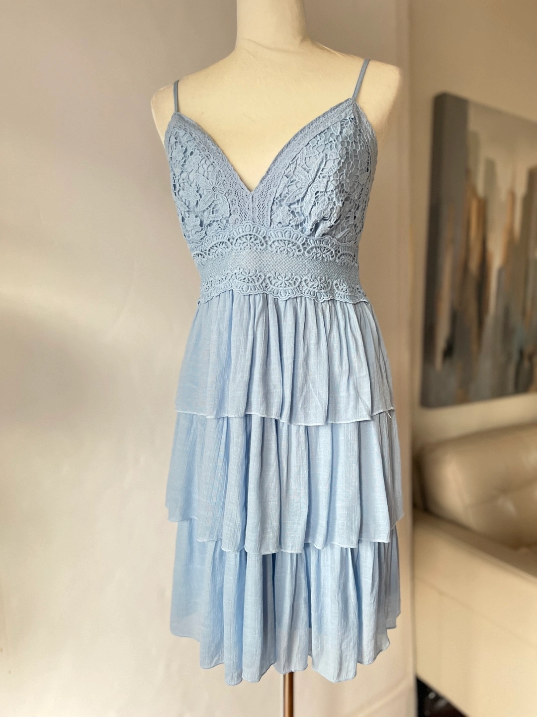 Beautiful light blue mini dress. Features a V-neckline with delicate lace overlay. Layered skirt. Adjustable spaghetti straps. Perfect for summer. Worn once to an outdoor summer wedding. Fits like a size 6 or 7. Good cup coverage (fits up to a C cup).