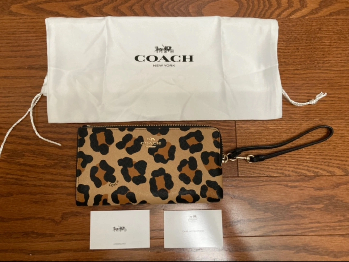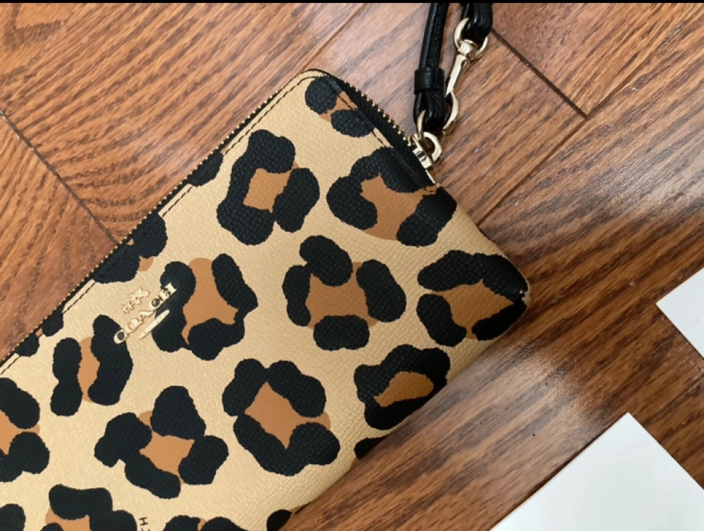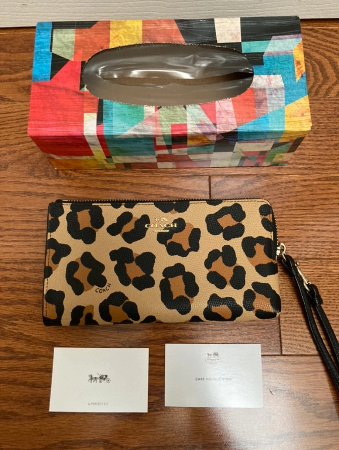Smoke free pet free home Pick up only Yonge & Steeles Item brought to driveway Genuine Coach Wristlet wallet in Leopard print leather. Brand new never used - includes dust bag Features detachable strap, 6 card slots, middle section comfortably fits an iPhone or other, bill slots. Tissue box for size reference