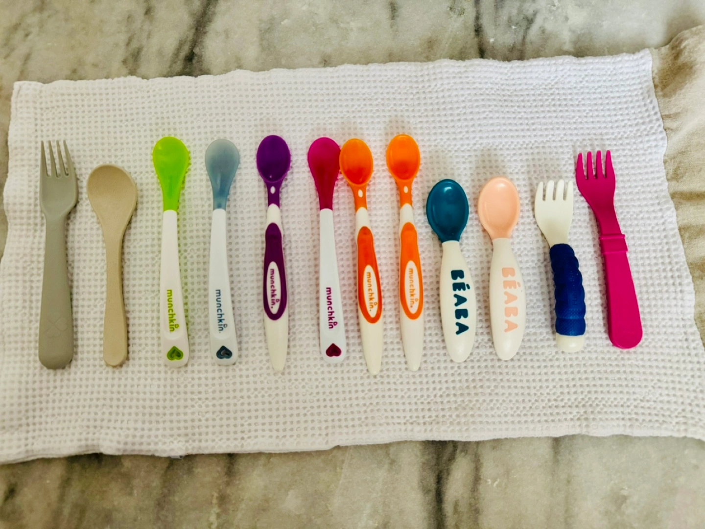 Set of 12 baby spoons and forks. Includes Munchkin and Béaba brands. Various colours. Great for little ones.