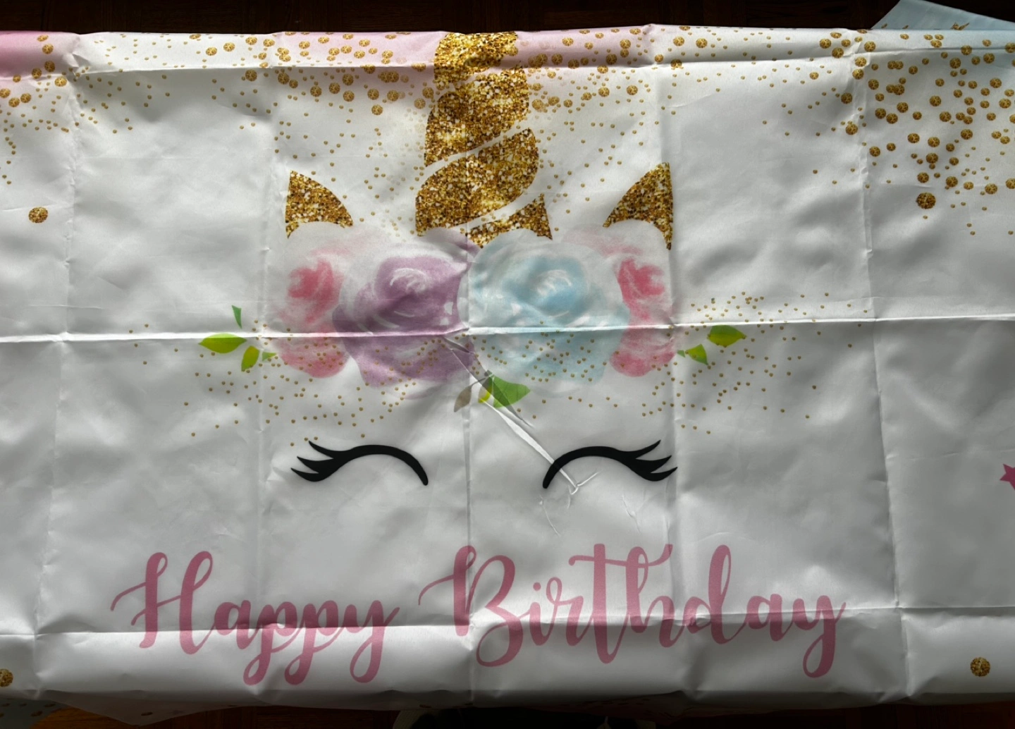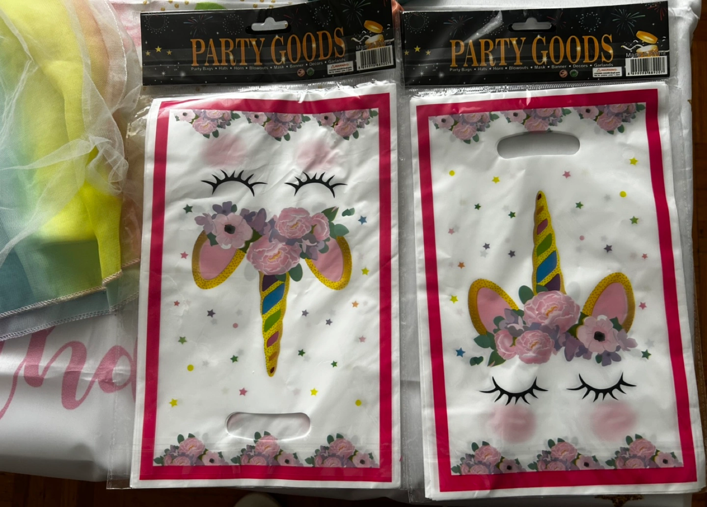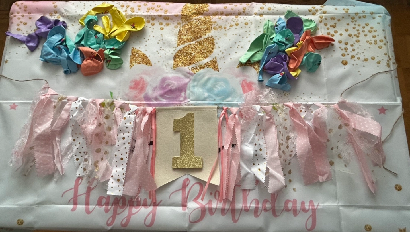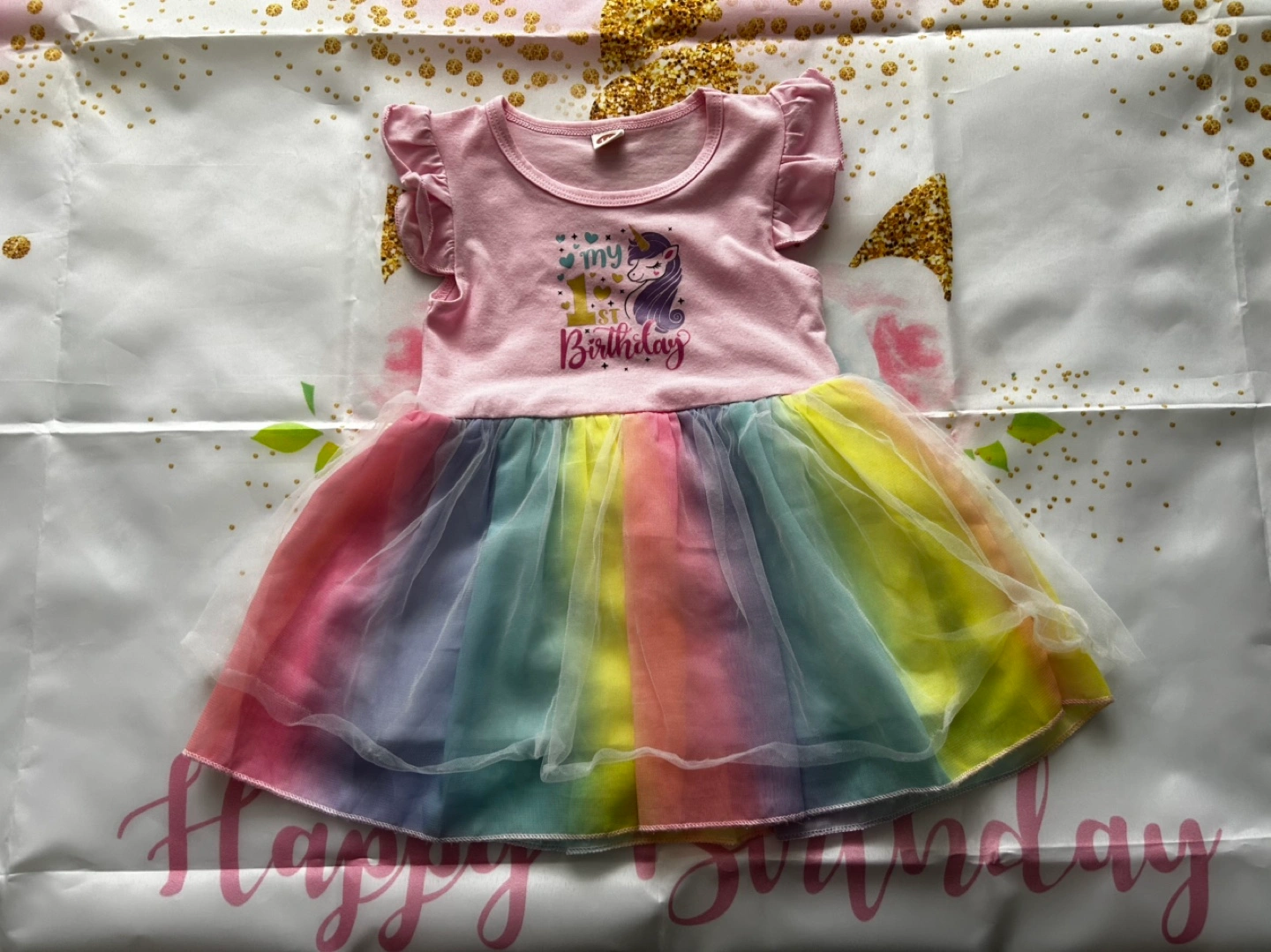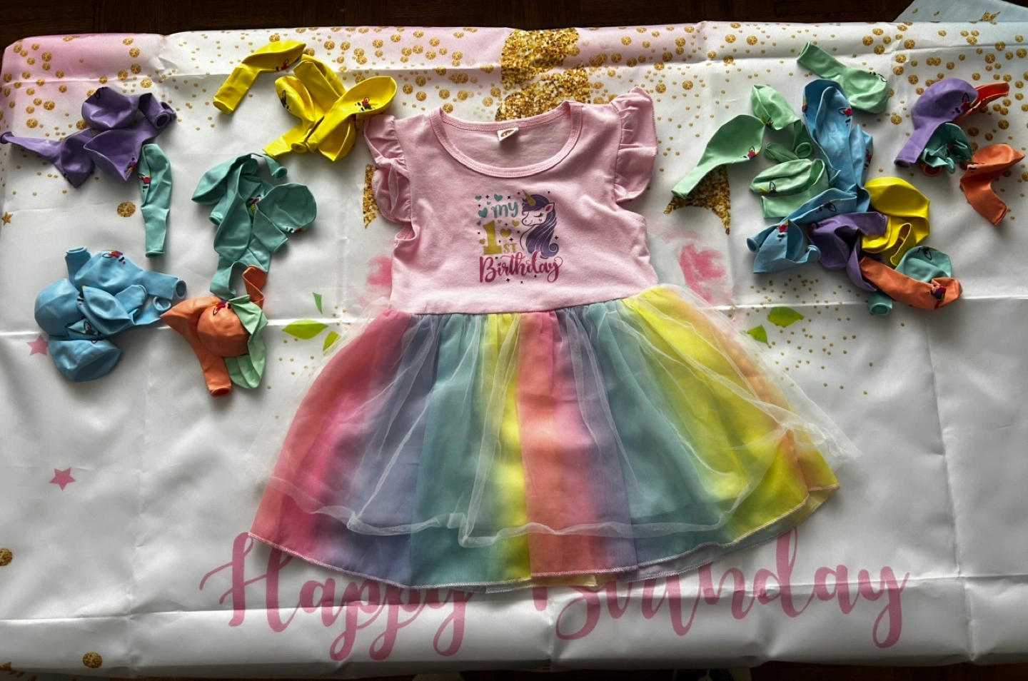 Adorable unicorn-themed first birthday party supplies. Includes a rainbow layered tutu 'My 1st Birthday' graphic dress. Also includes unicorn-themed party favour 2 packs of unused loot bags 10 pcs total and a high chair banner. Lots of pastel coloured balloons included too 44pcs. Backdrop 39 by 59inches included.