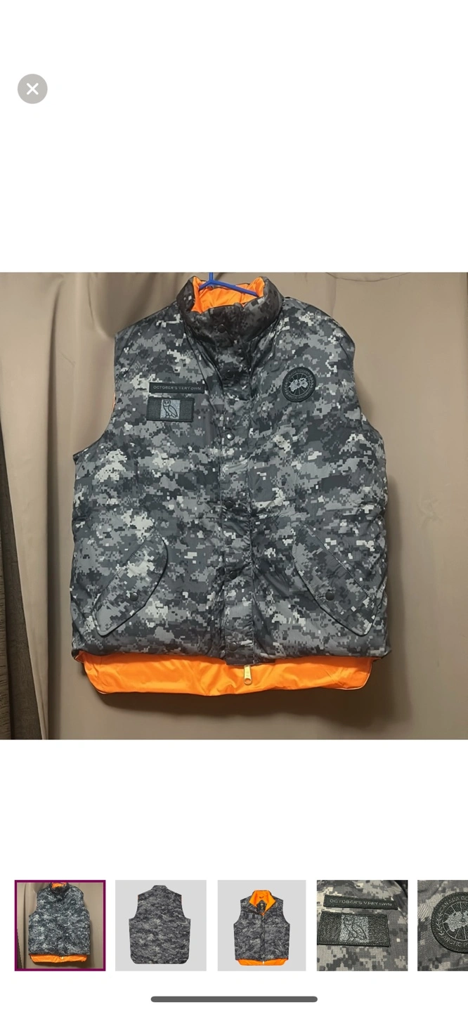 Authentic OVO October's Very Own x Canada Goose Freestyle vest in Like New and Excellent Condition! Size Large! get ready to style this vest for Fall and Winter! hard to find this collab! Grey camo and orange lining inside! Please note-no holographic sticker. 100% Authentic Men's puffer vest. Camouflage pattern. Orange lining. Features OVO and Canada Goose patches.