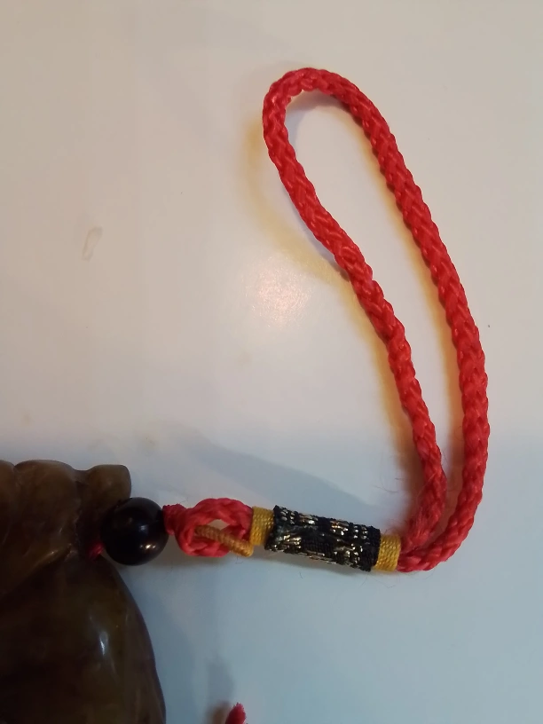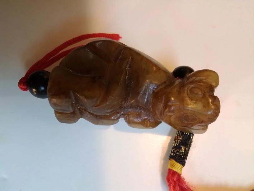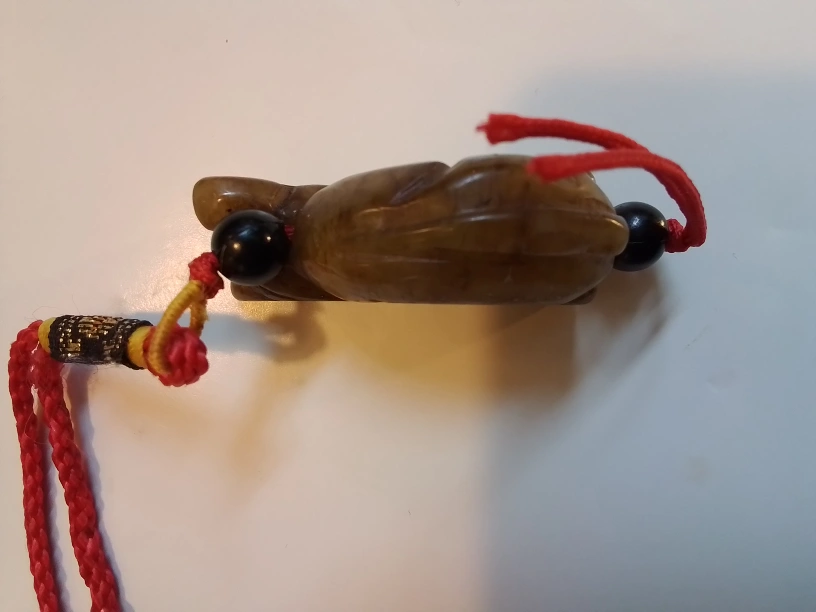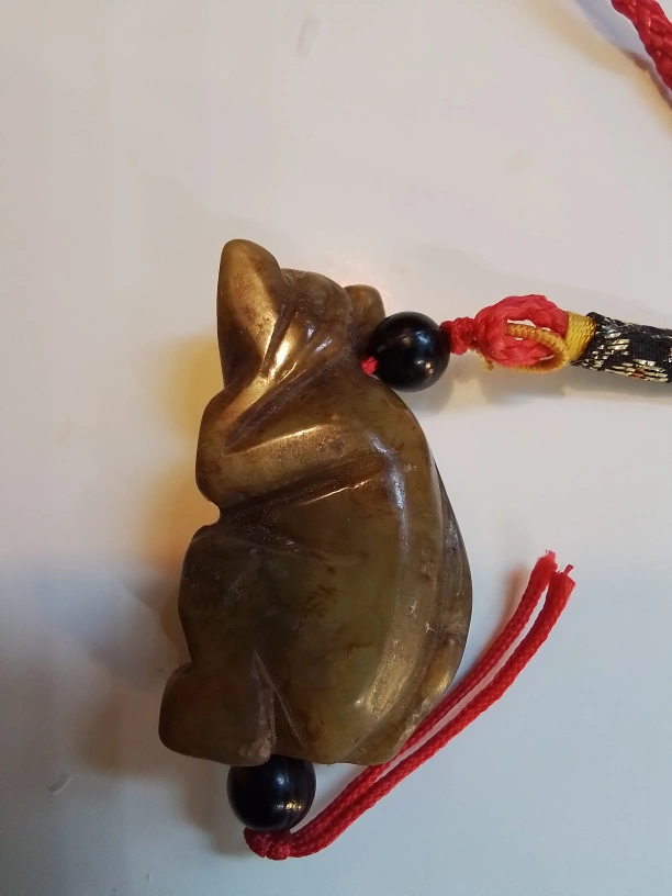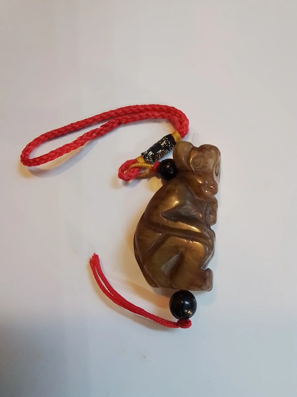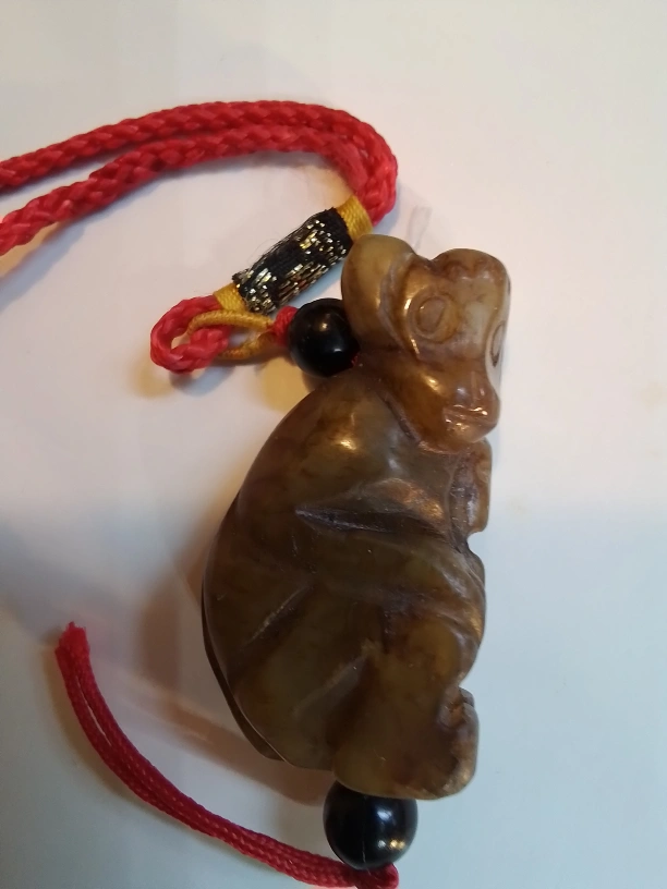 Vintage Chinese Jade Carved Monkey Toggle Hand-carved Jade Monkey Pendant Intricately carved jade monkey figurine. Features a red cord and black beads. Collectible item, unique gift. This finely carved monkey figure is crafted from rich, greenish-brown jade stone, depicted in a seated position with intricate detailing and smooth polishing. The toggle is attached to a vibrant red braided cord, accented with black beads and a decorative black and yellow band. H: 3 cm, W: 6 cm, 24g Estimate 150.00 - 300.00 USD Pickup at Young Street and Steels Ave