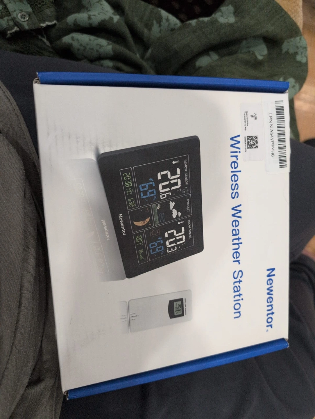 New in box. Wireless weather station. Includes indoor and outdoor sensors. Displays time, temperature, humidity, and forecast.