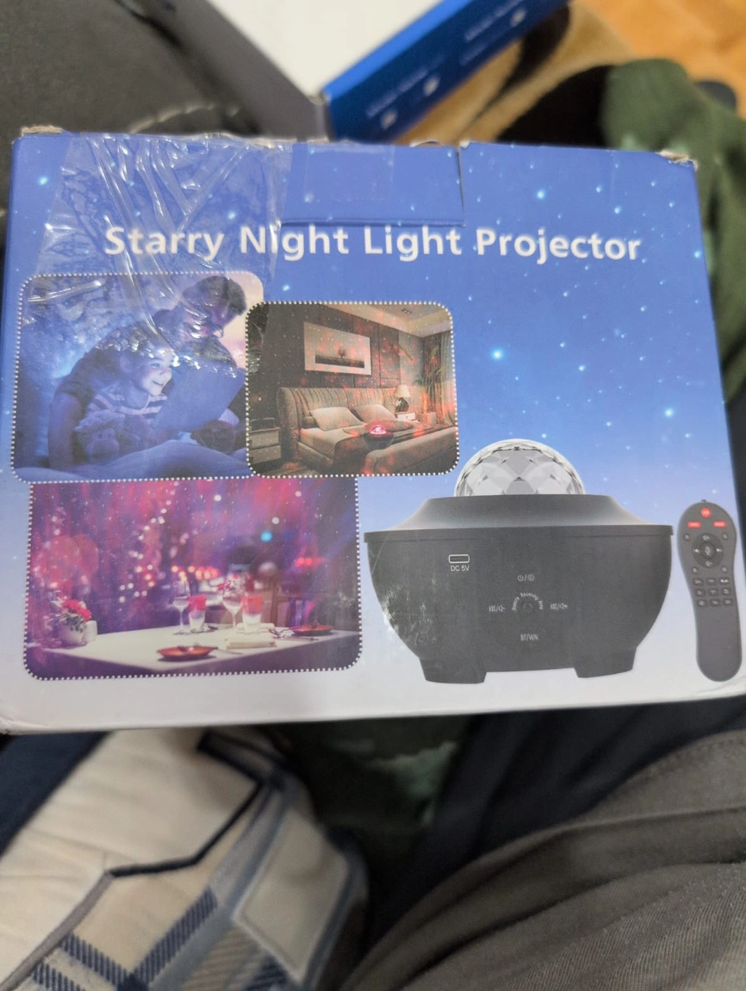 New in box. Features multiple light settings. Includes remote control. Creates a relaxing atmosphere.
