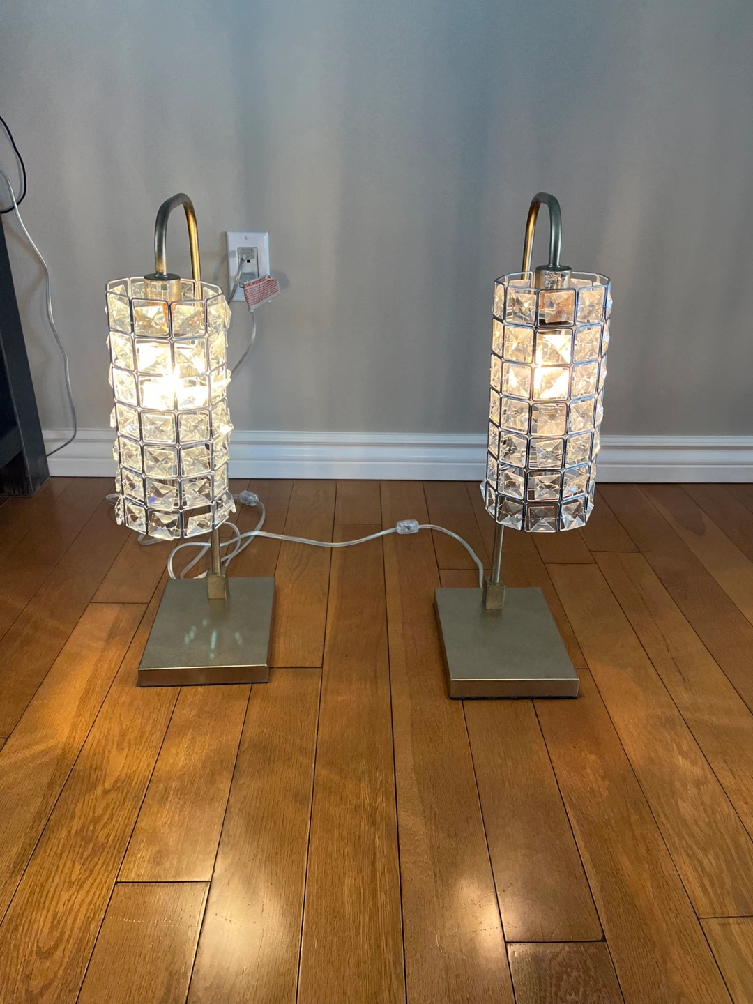 Set of two elegant table lamps. Features crystal accents and a brushed gold finish. Modern design. Perfect for a bedside table or living room. Height 21.5”, base is 6”x8”. Cord is approximately 6feet long