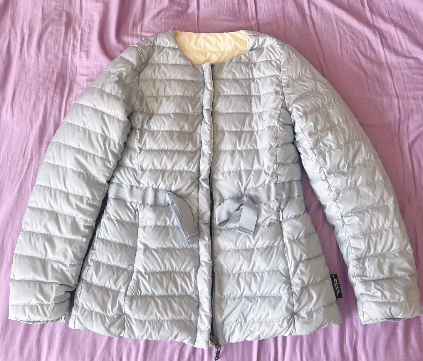 Genuine.This lightweight down jacket can be worn on both sides. Adjustable waist drawstring and double-sided zipper pockets. The label on the pocket has been cut. If you mind, please do not buy it.Only worn once.Cash only