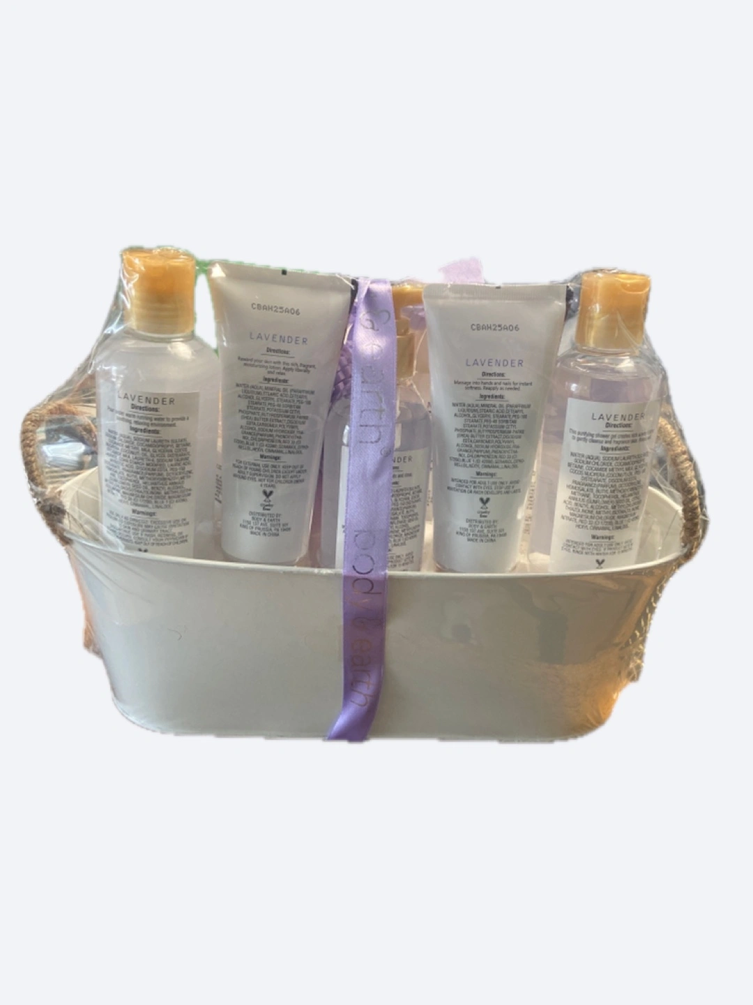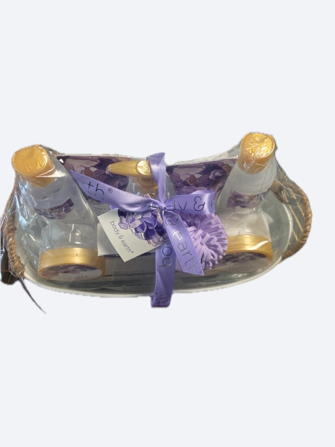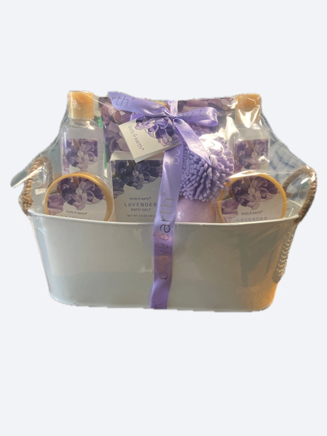 New, unopened Body & Earth Lavender gift set. Includes lotion, shower gel, bath salts, and more. Packaged in a cute metal basket. Perfect gift!
