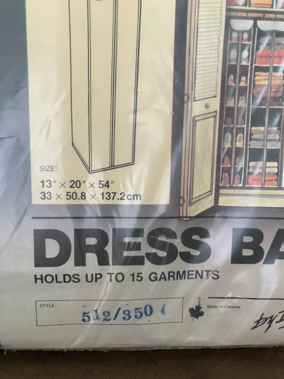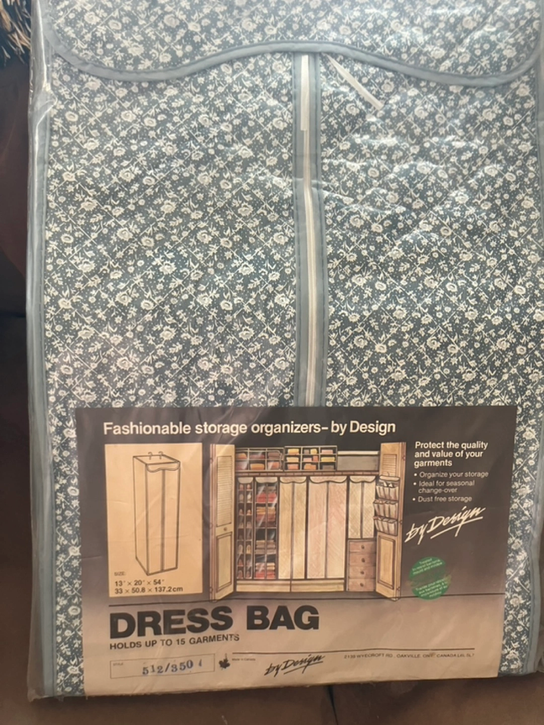 Vintage dress bag by Design. Holds up to 15 garments. Measures 13" x 20" x 54". Made in Canada. There are 2 available, $4 each
