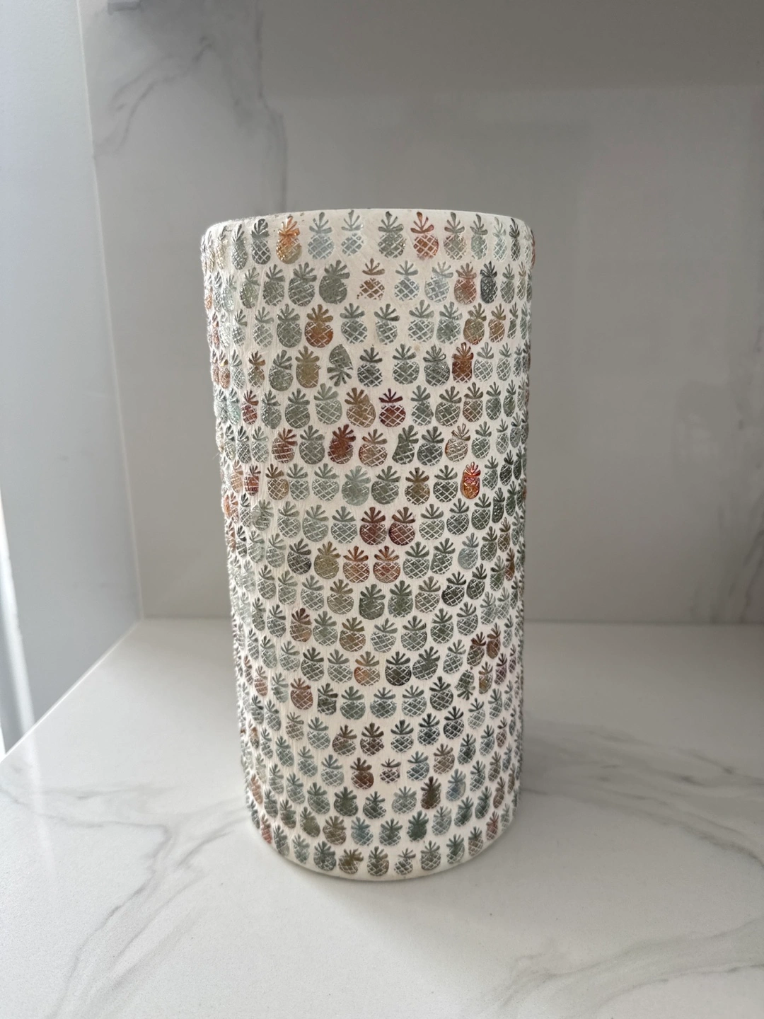Glass cylinder vase. Features an all-over pineapple print in muted greens and browns. Perfect for home decor.