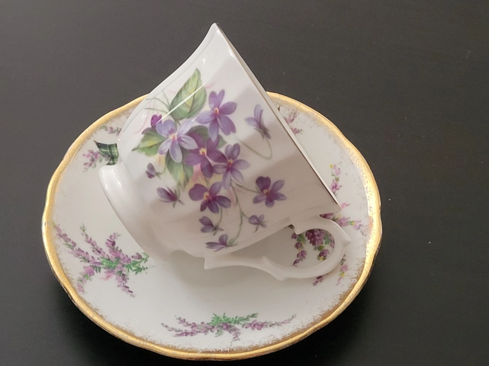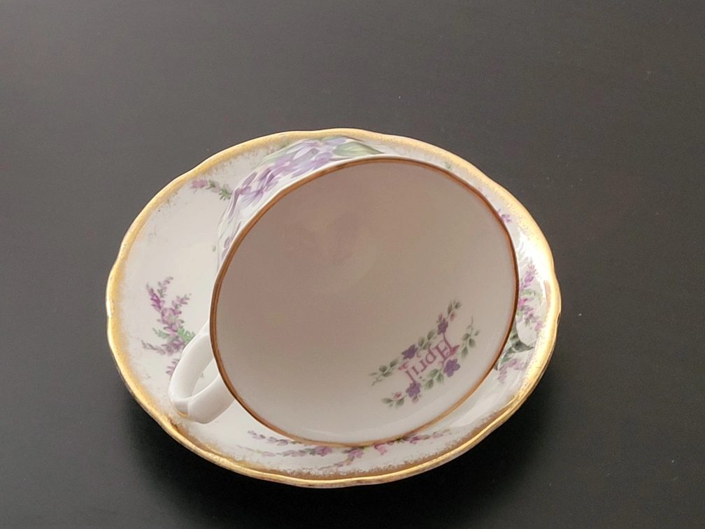 Beautiful teacup and saucer set. Features purple floral pattern. Gold trim. Part of the Tartan Series. Made in England. Fine bone china. Cash only Pick up only