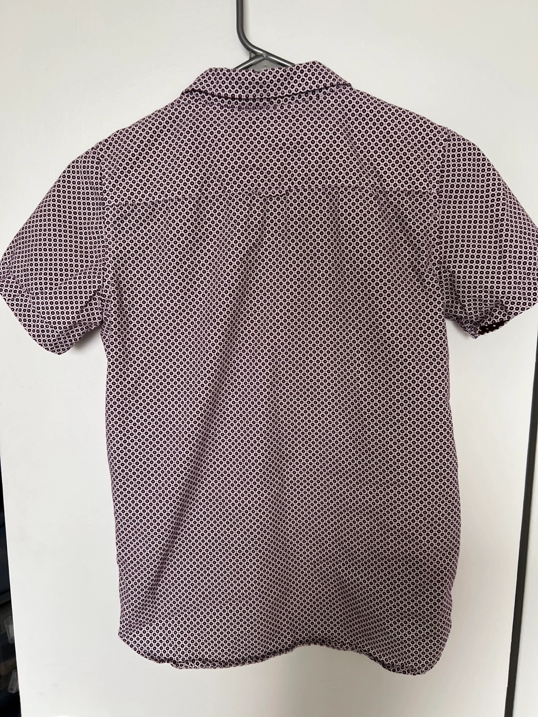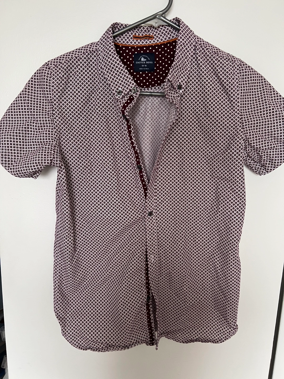 Burgundy and white patterned button-down shirt. Short sleeves. Great for casual wear. Size 13-14