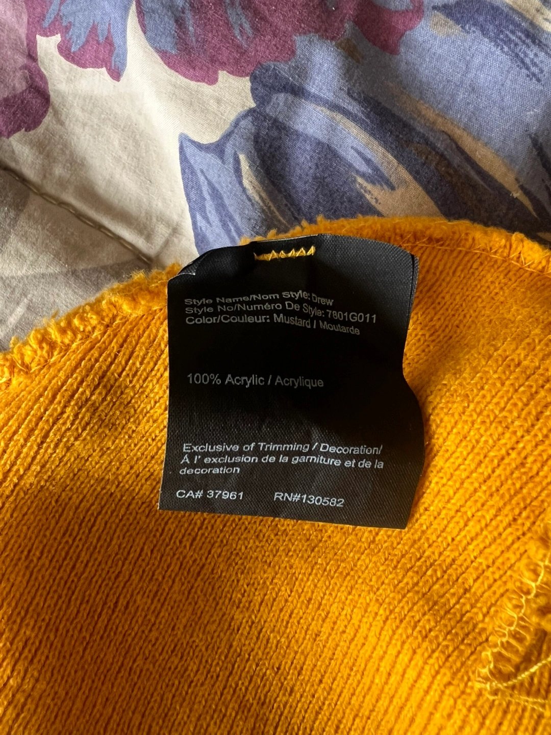 Warm and cozy mustard yellow beanie. 100% acrylic. Features a small black logo on the cuff. Perfect for fall and winter. Cash McNicoll & Midland Area Pickup (3720 Midland Avenue, Toronto, CA M1V 4V3) Smoke Free Home π‘ Sanitized and Washed Thoroughly π§Ί Bundle to Save More π Offers and Questions are Welcome π