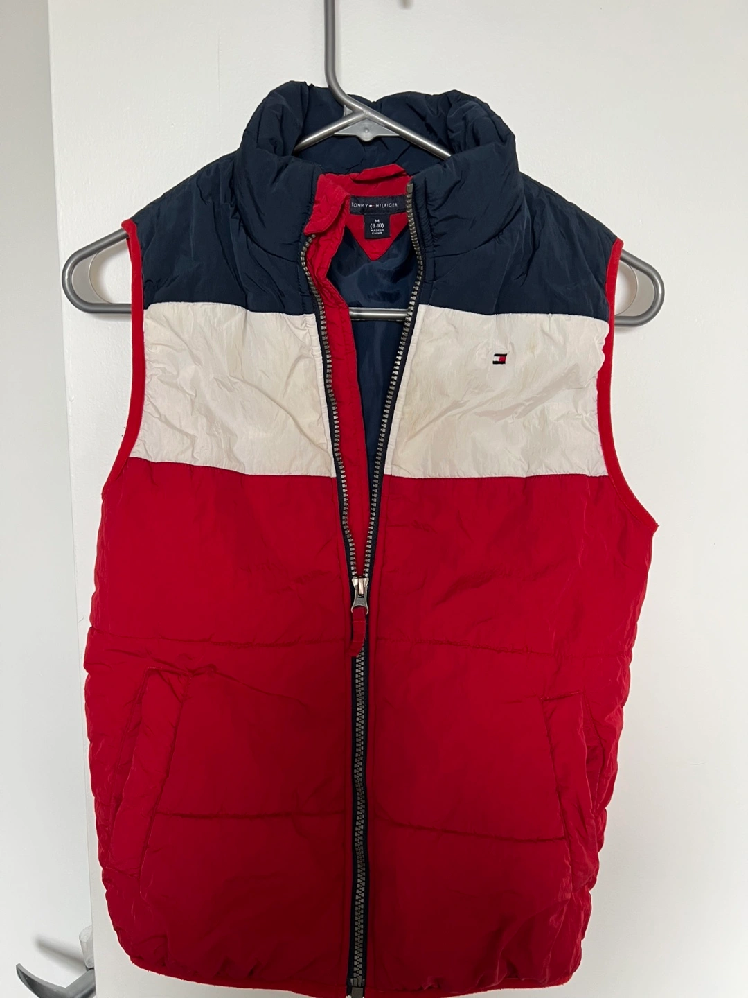Colour-blocked puffer vest. Red, white, and navy blue. Zip closure. Great for layering. Good used condition.