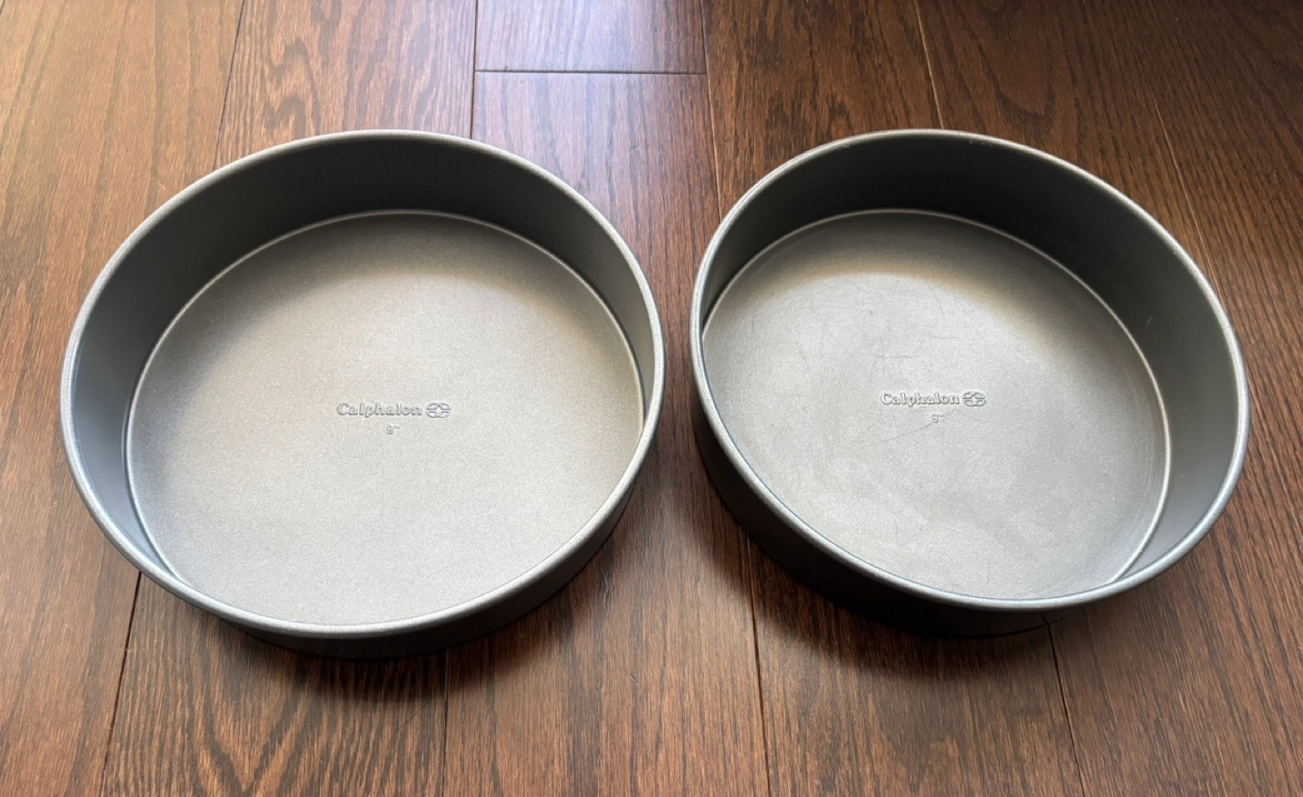 Calphalon Nonstick Bakeware, Round Cake Pan, 9-inch Dimensions: 9 x 2 inch Price: $15 each Condition: Excellent No dents, only minor scratches (as seen in pics). Non-stick coating intact. Location: Bloor & Jane "From a smoke and pet free home"