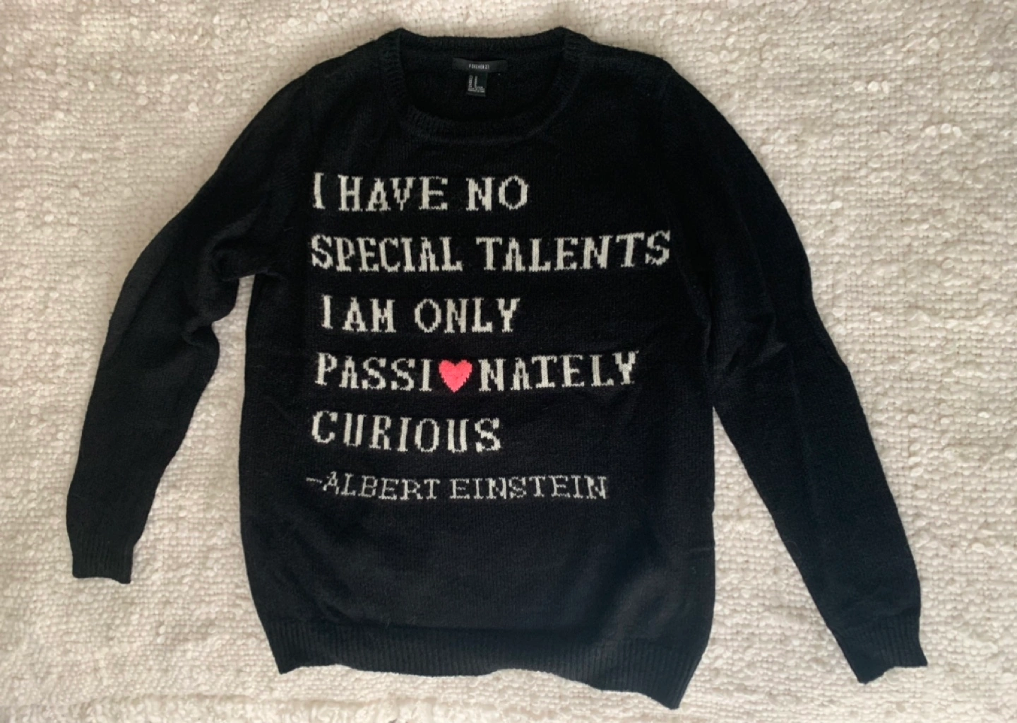 Black knit sweater. Features Albert Einstein quote. Relaxed fit Medium size. Pick up near Spadina Ave & Front St W Cash only please!
