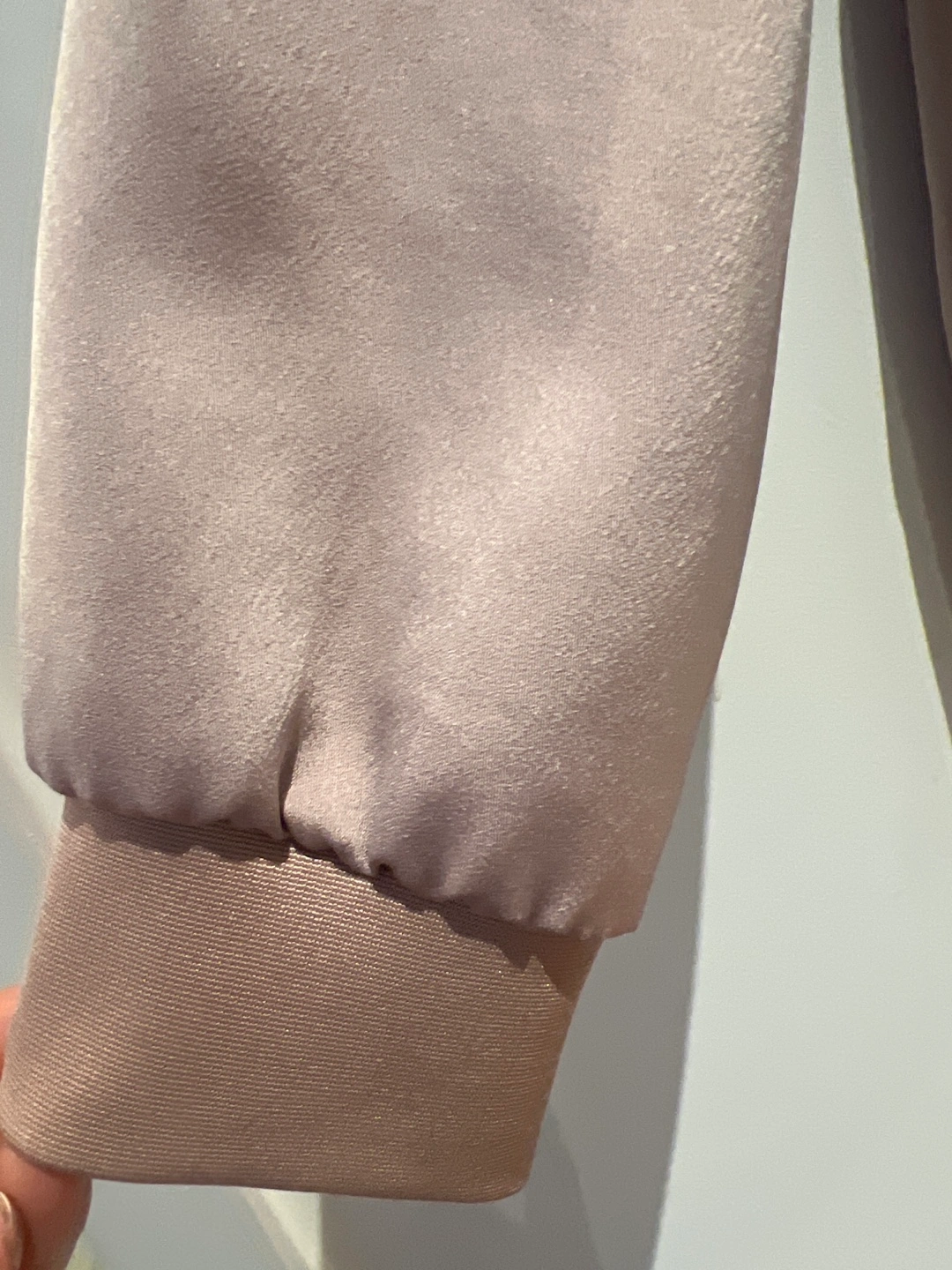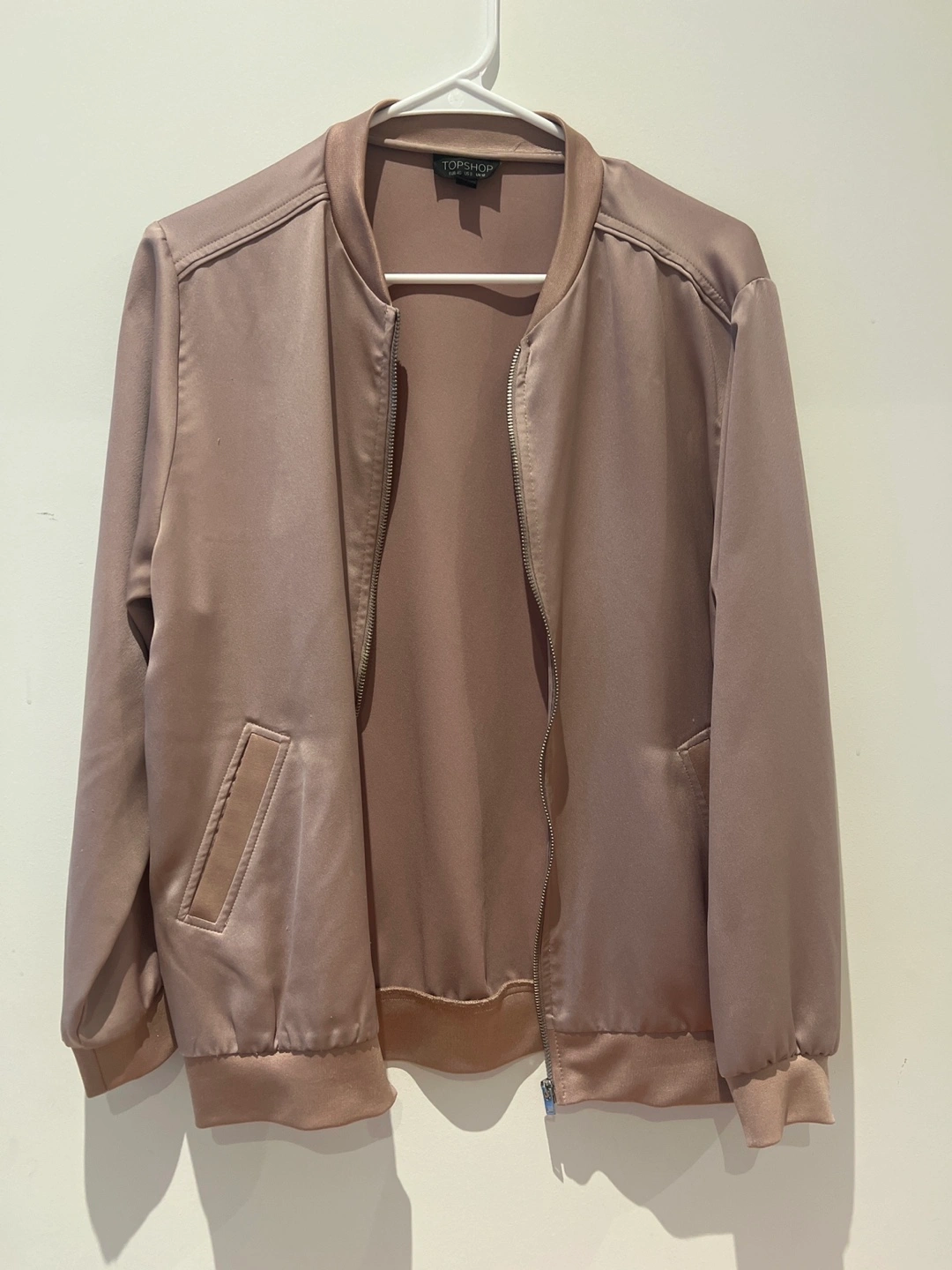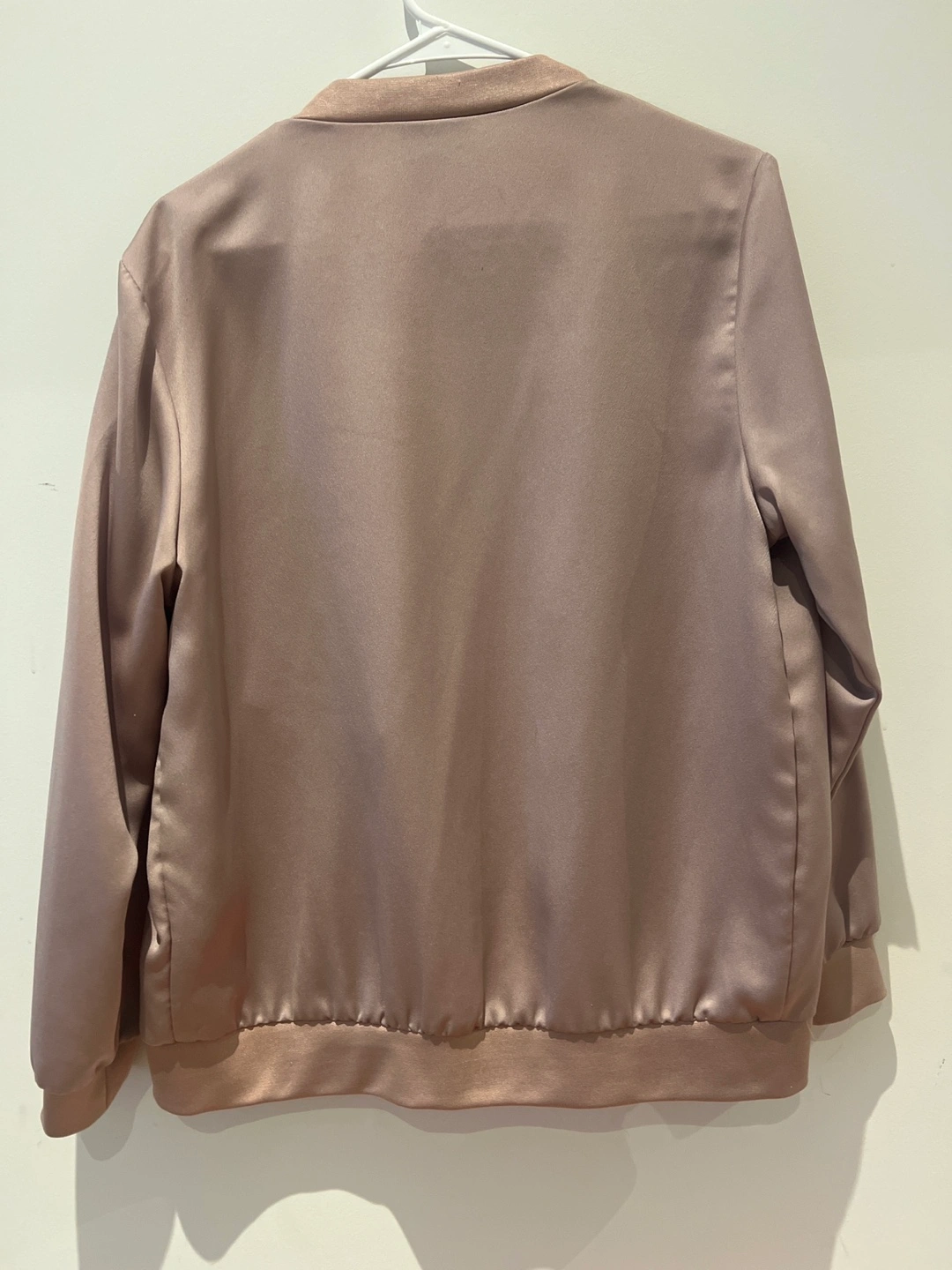 Dusty rose coloured satin bomber jacket. Features a zipper closure and ribbed cuffs and hem. Two side pockets. Size 8.