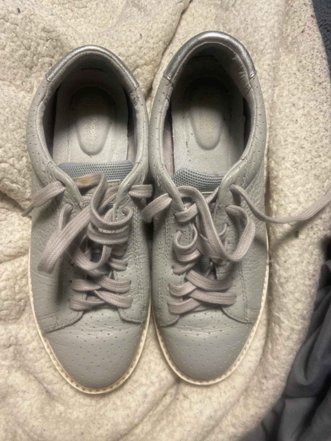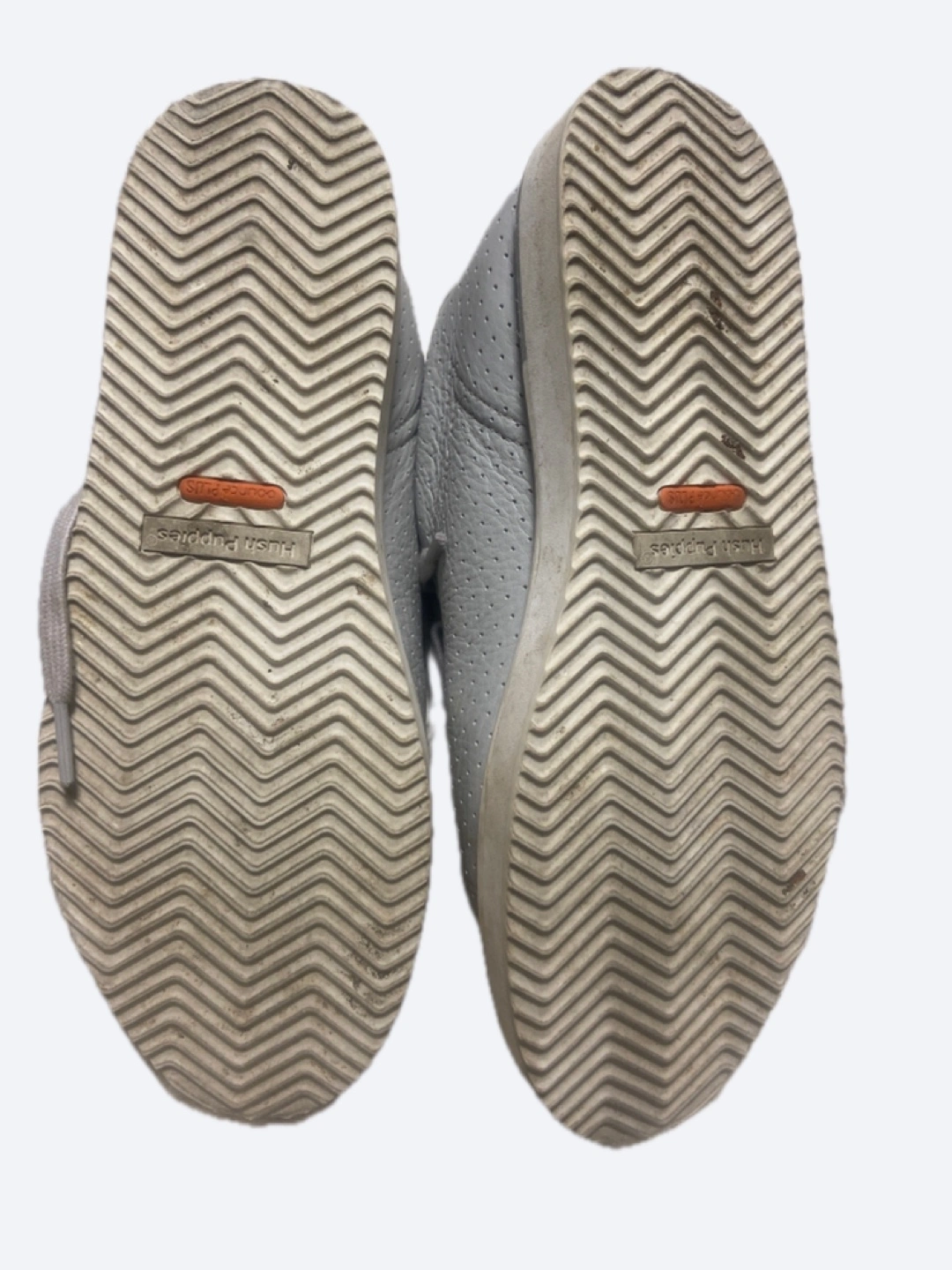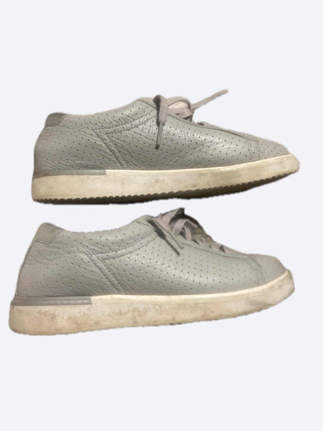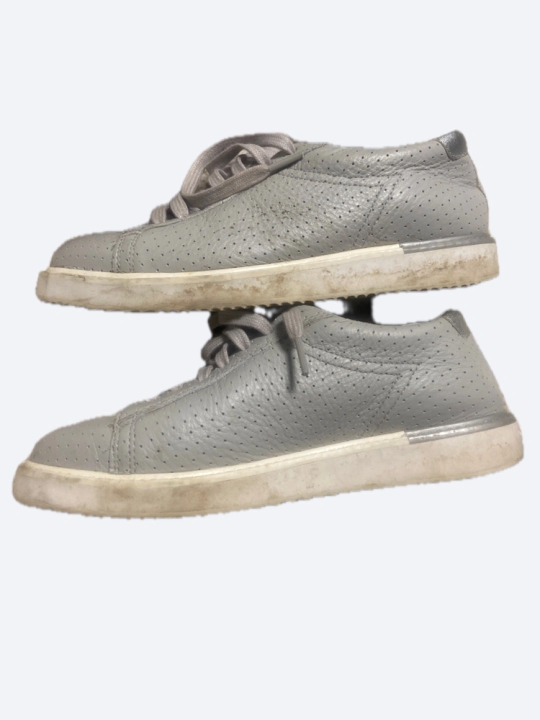 Grey leather sneakers. Lace-up closure. Perforated detailing. Slightly worn. Size US 8.5