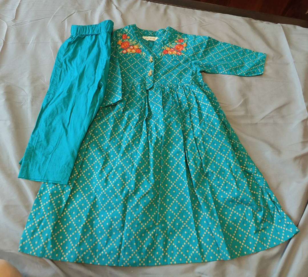 Adorable girls' kurta and shalwar set. Features teal fabric with gold polka dots and embroidered flowers. Long sleeves, button closure. Includes matching teal shalwar. Size 12/18 months.