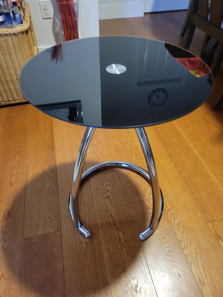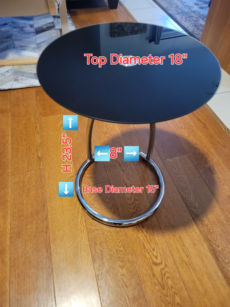 Porch & Den Shiloh Chrome Metal Circular Accent modern side table with black glass top, and double metal chrome legs, and circle base. Dimentions: Glass top diameter 18"/46cm Base diameter 15"/38cm Height 23.5"/60cm Condition Excellent. It used for 3 months only.