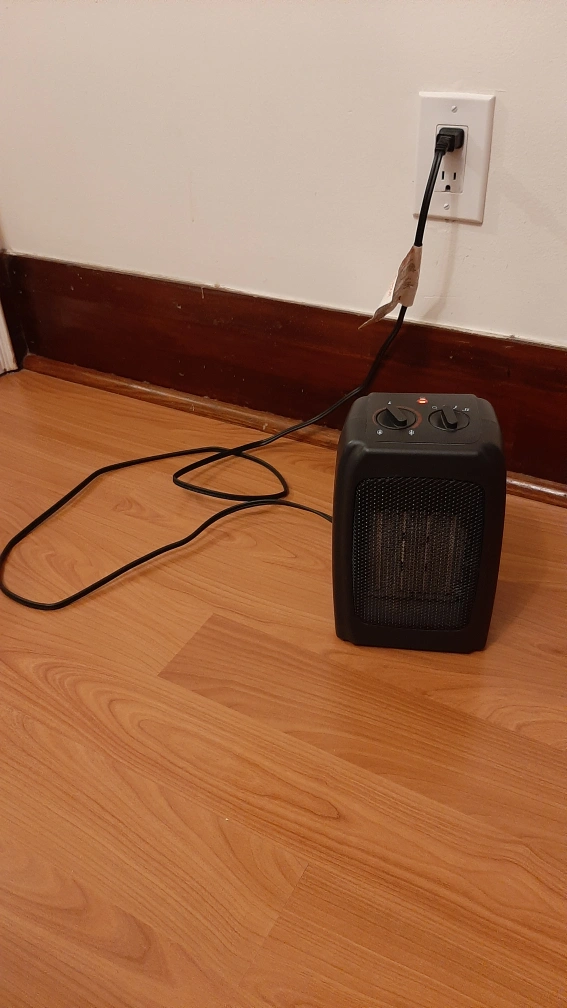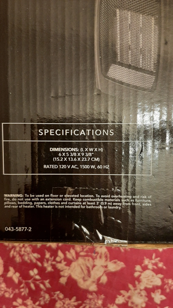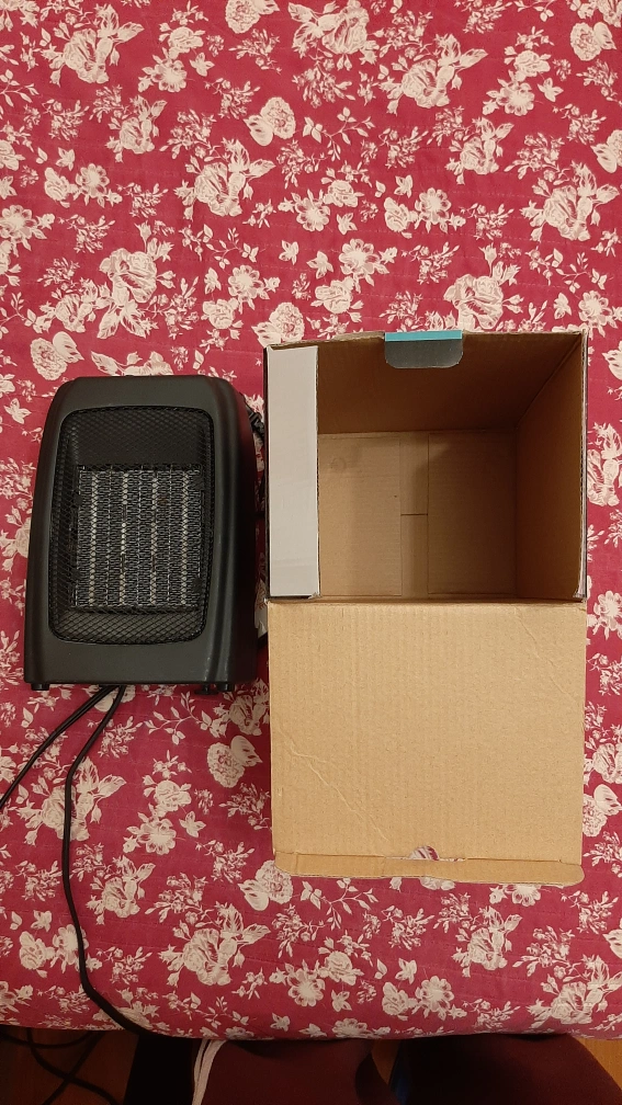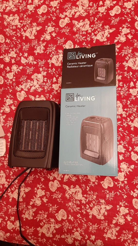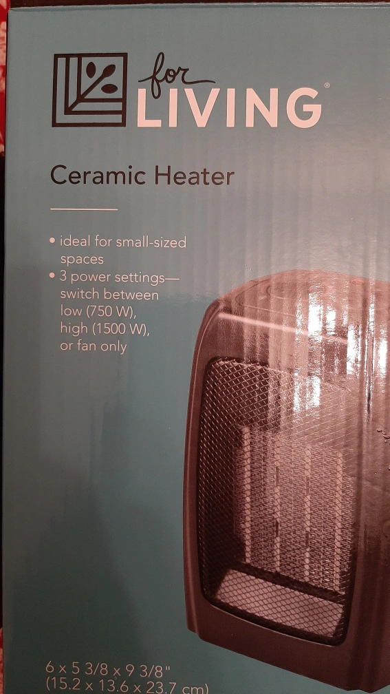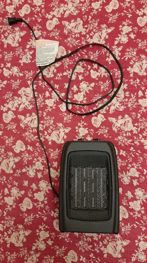 Black ceramic heater. Three power settings: low (750 W), high (1500 W), or fan only. Used only a few times, in excellent conditions.