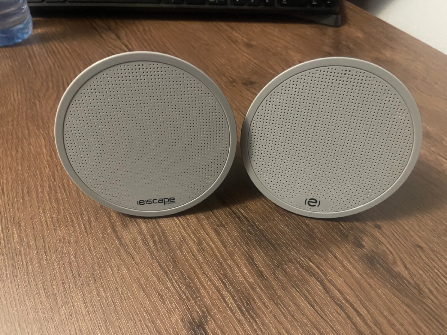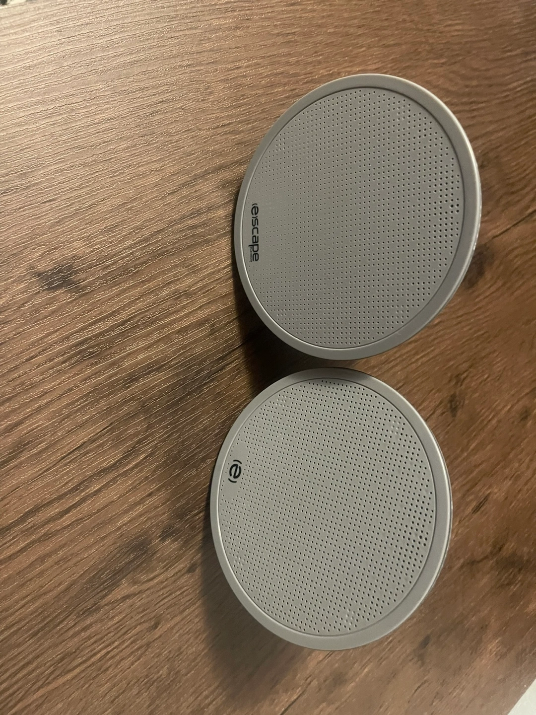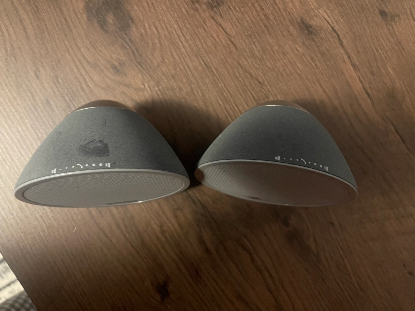Two grey wireless speakers. Round and cone-shaped designs. Small and portable. Good condition.
