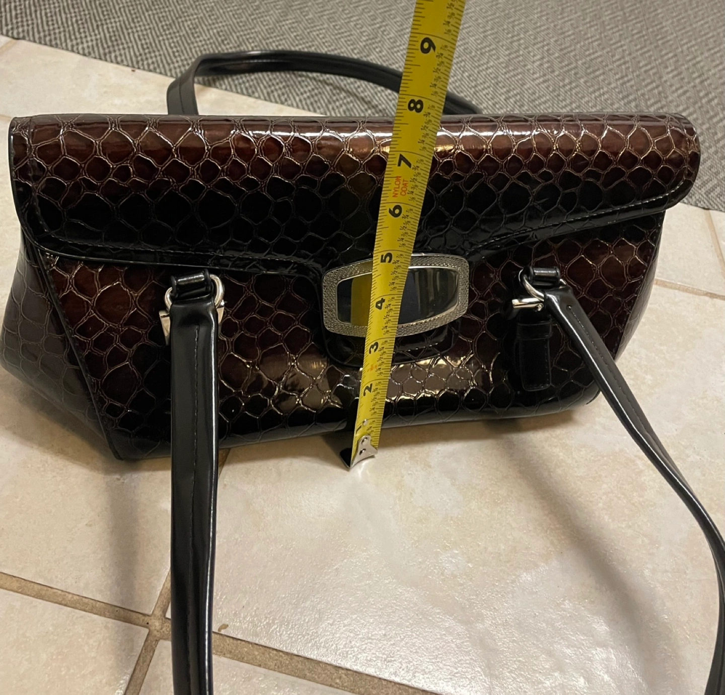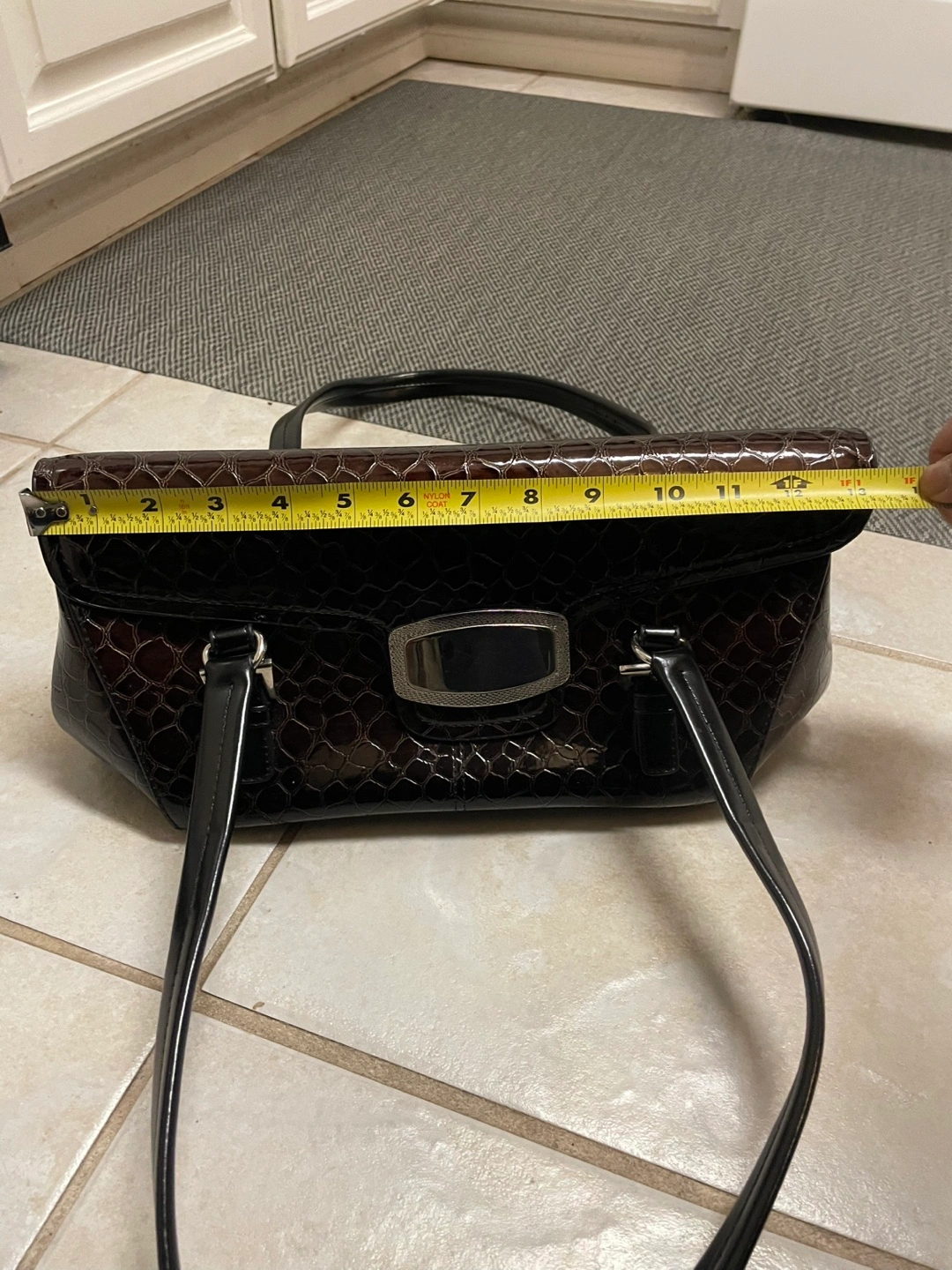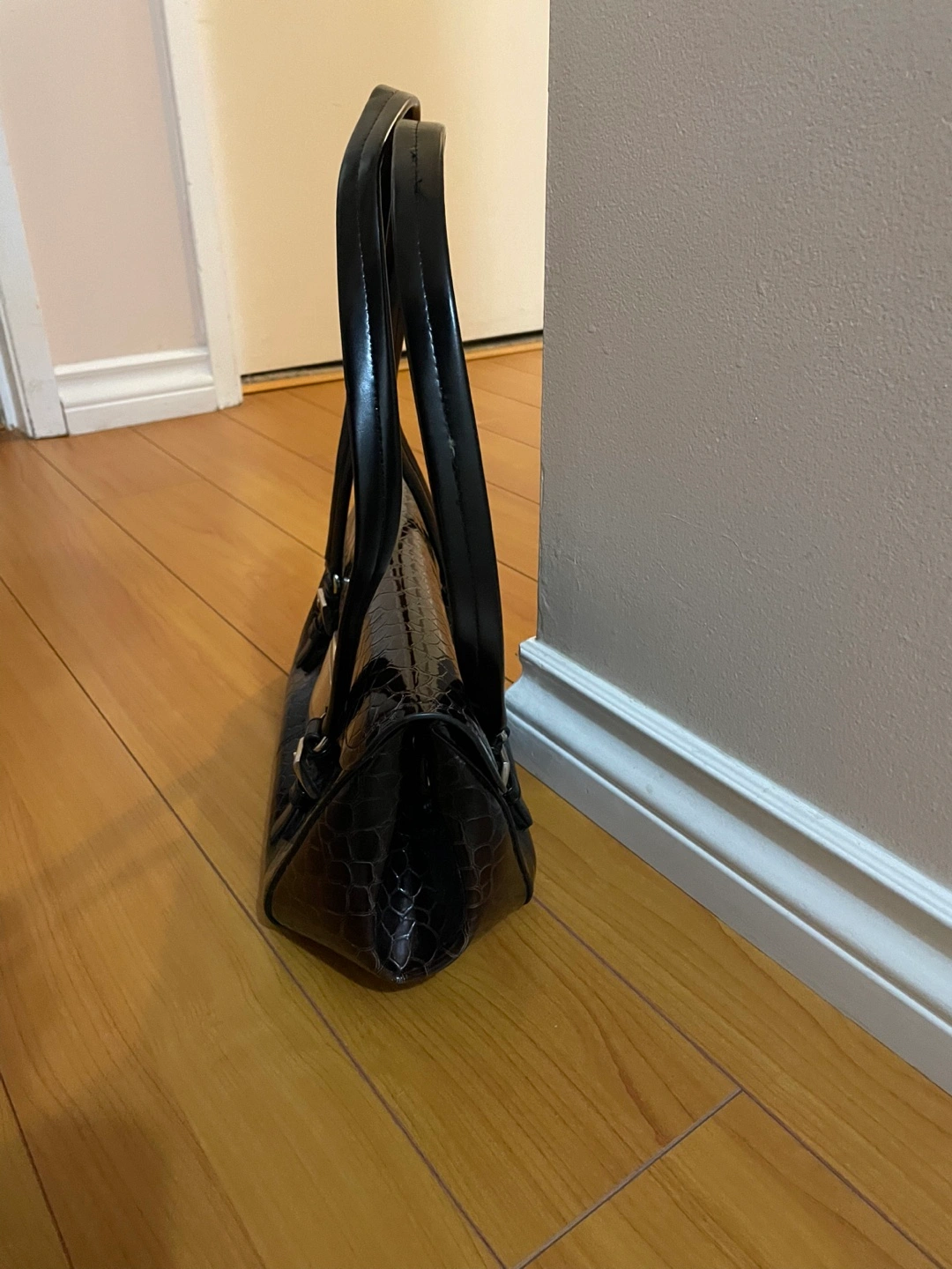Stylish black handbag. Crocodile pattern. Two top handles. Zipper closure. Interior pocket. Measures approximately 13 inches wide.