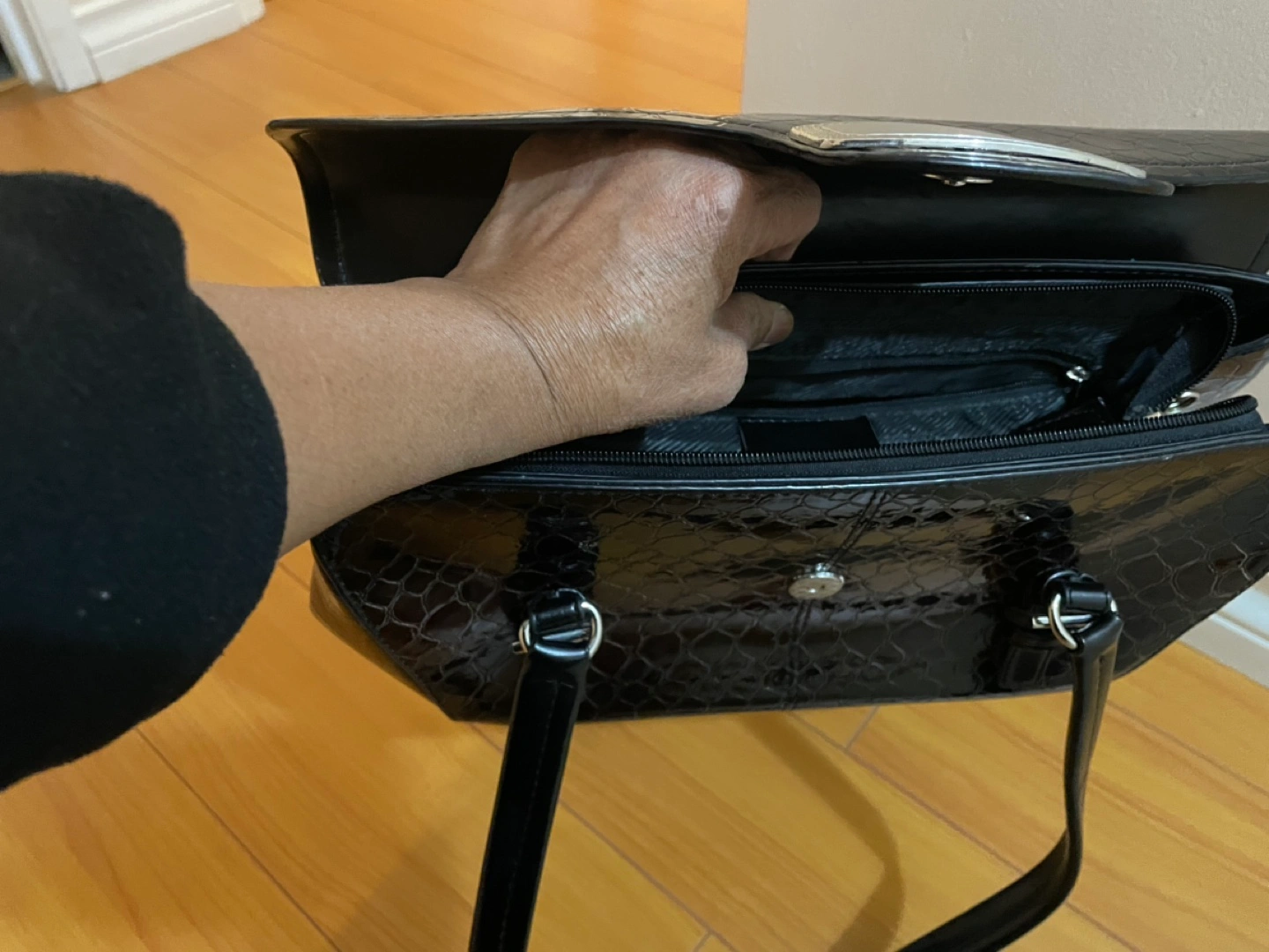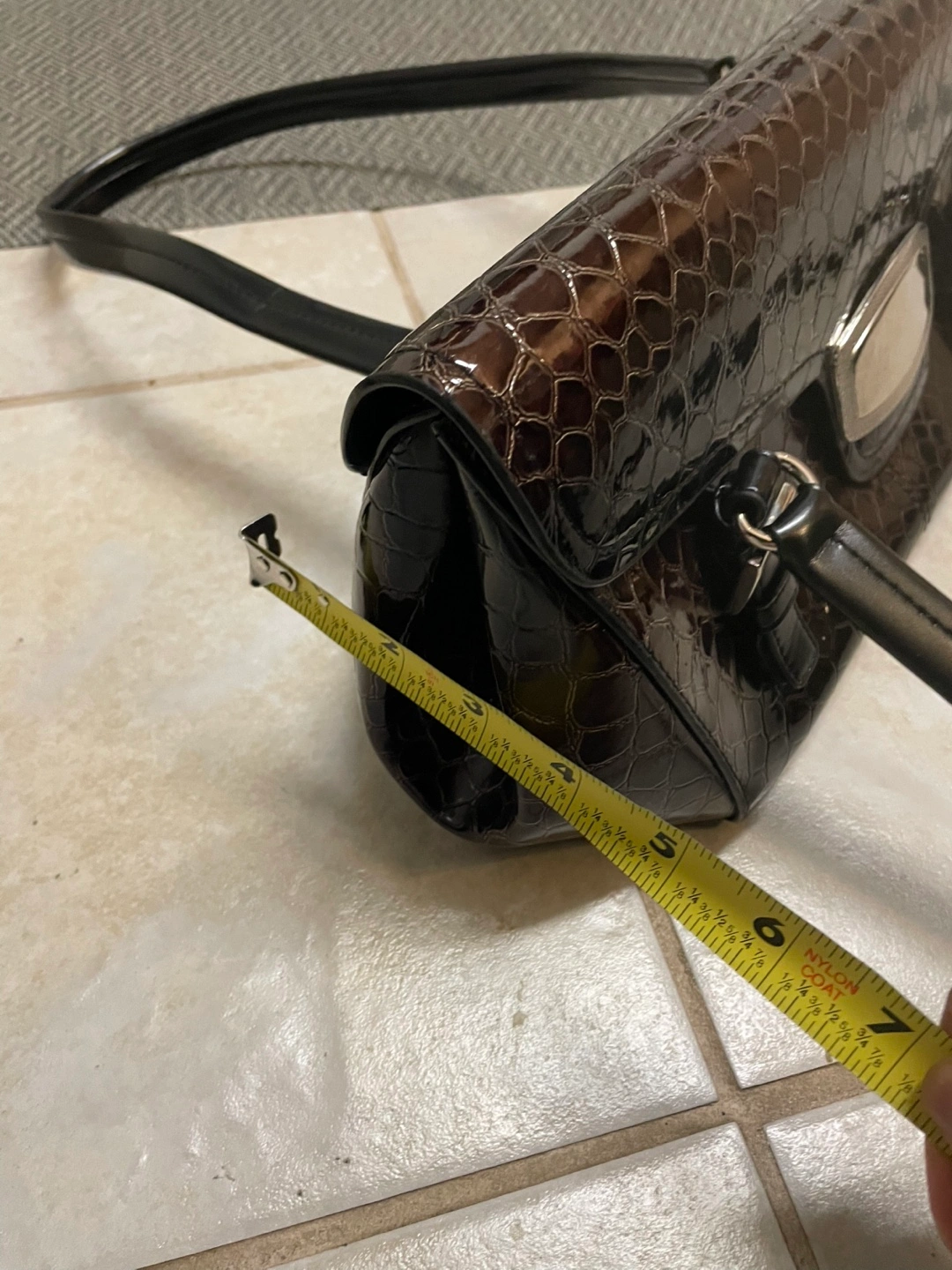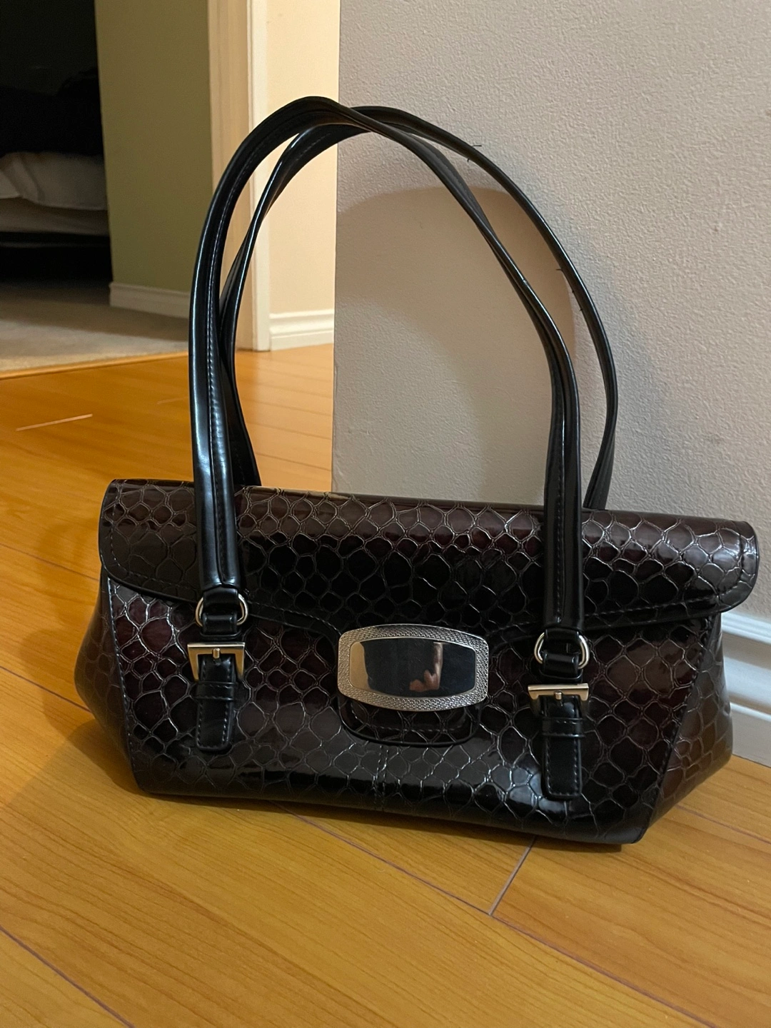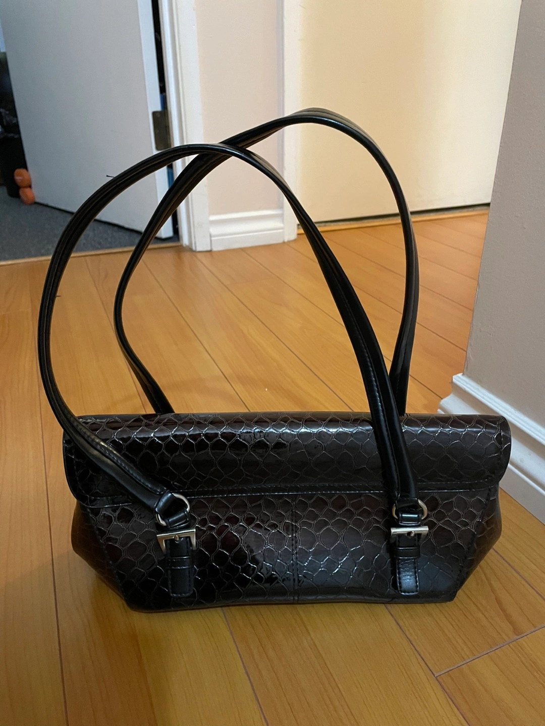 Stylish black handbag. Crocodile pattern. Two top handles. Zipper closure. Interior pocket. Measures approximately 13 inches wide.