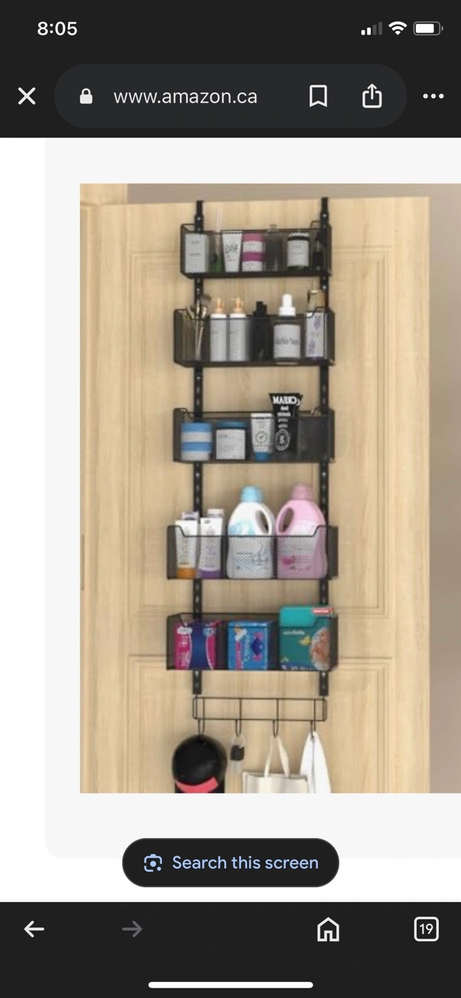 Black metal over-the-door organizer. Four large capacity baskets and adjustable hanging hook. Great for bathroom, bedroom, kitchen, pantry, closet, or cabinet.