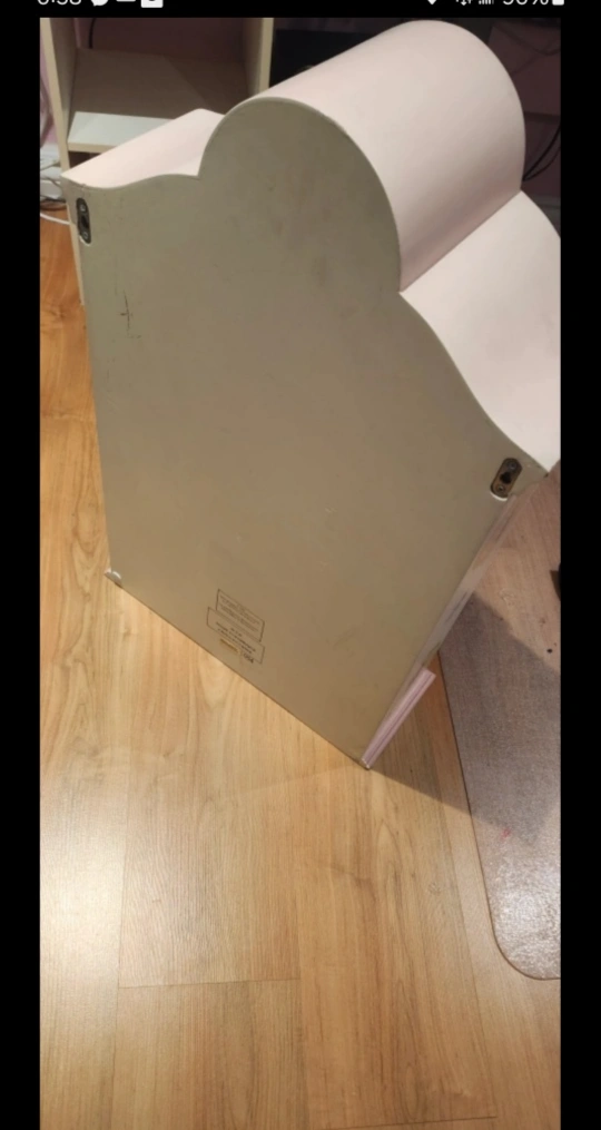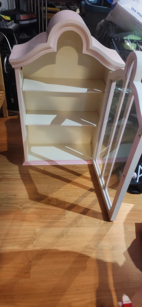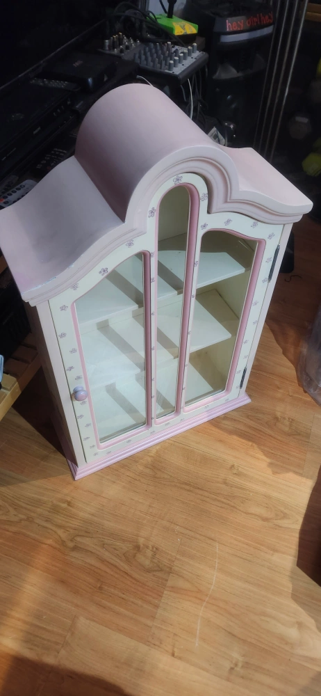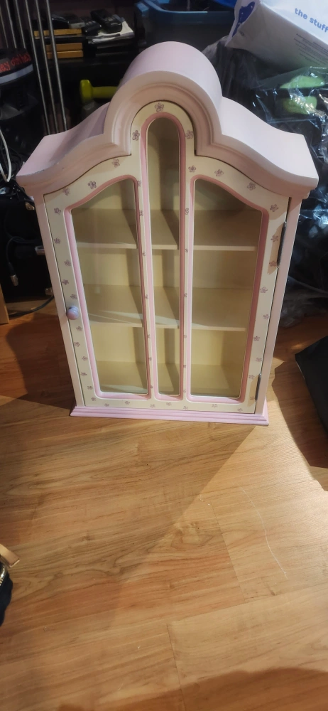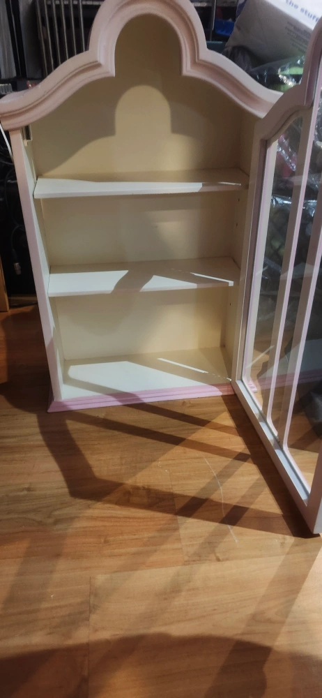 Adorable small wall-mounted cabinet 7"D ×17"W×28"H .Features glass door and multiple shelves. Perfect for displaying collectibles or small items. Pink and cream colour scheme. price firm final Light and easy to hang. price only cash only pickup no delivery. 801 O'Connor drive outside TD Canada Trust bank door.