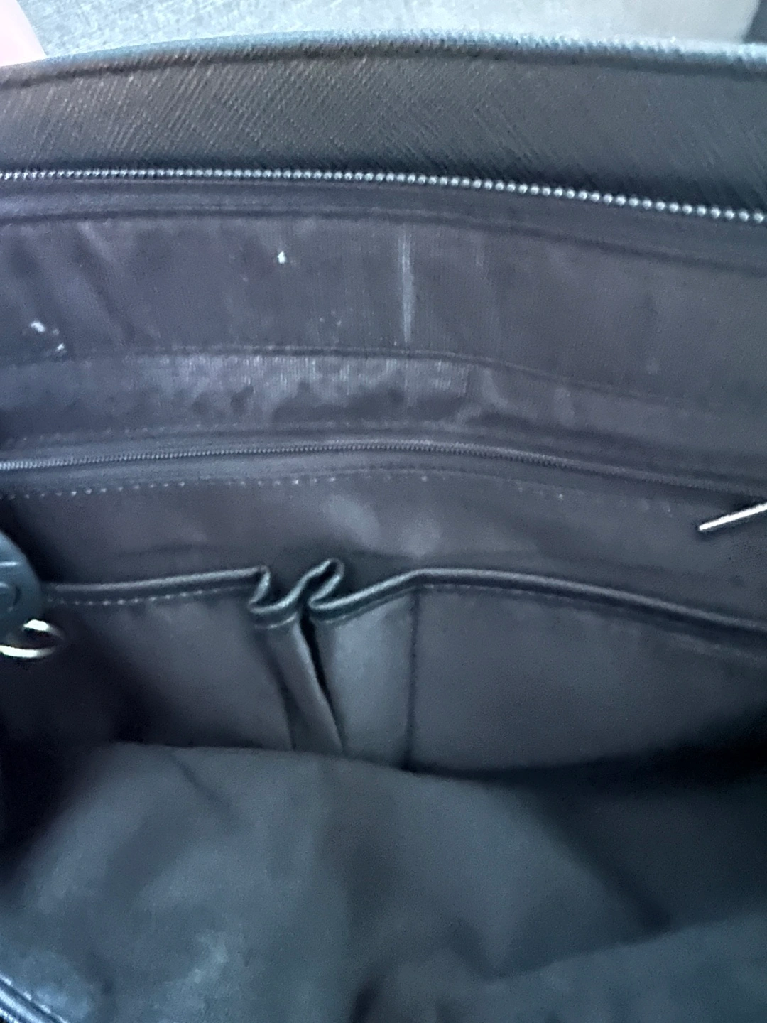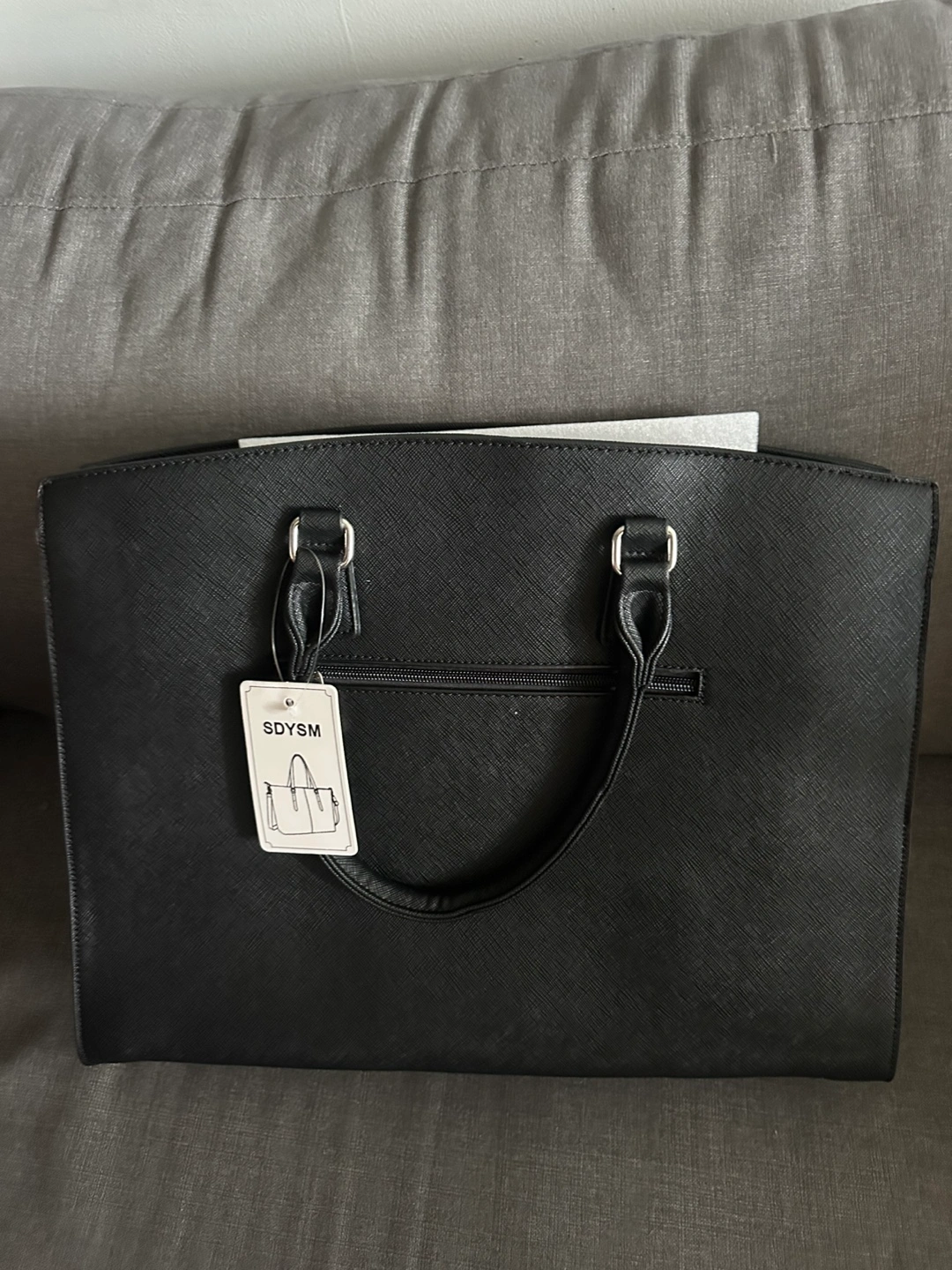 Black tote bag. Features two top handles and a detachable shoulder strap. Multiple interior pockets. Zipper closure. Stylish and functional.