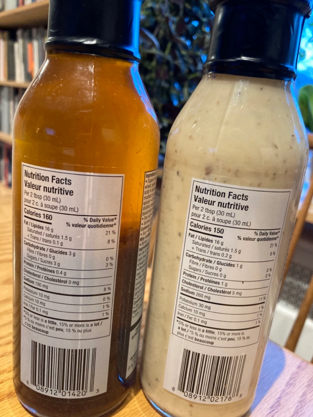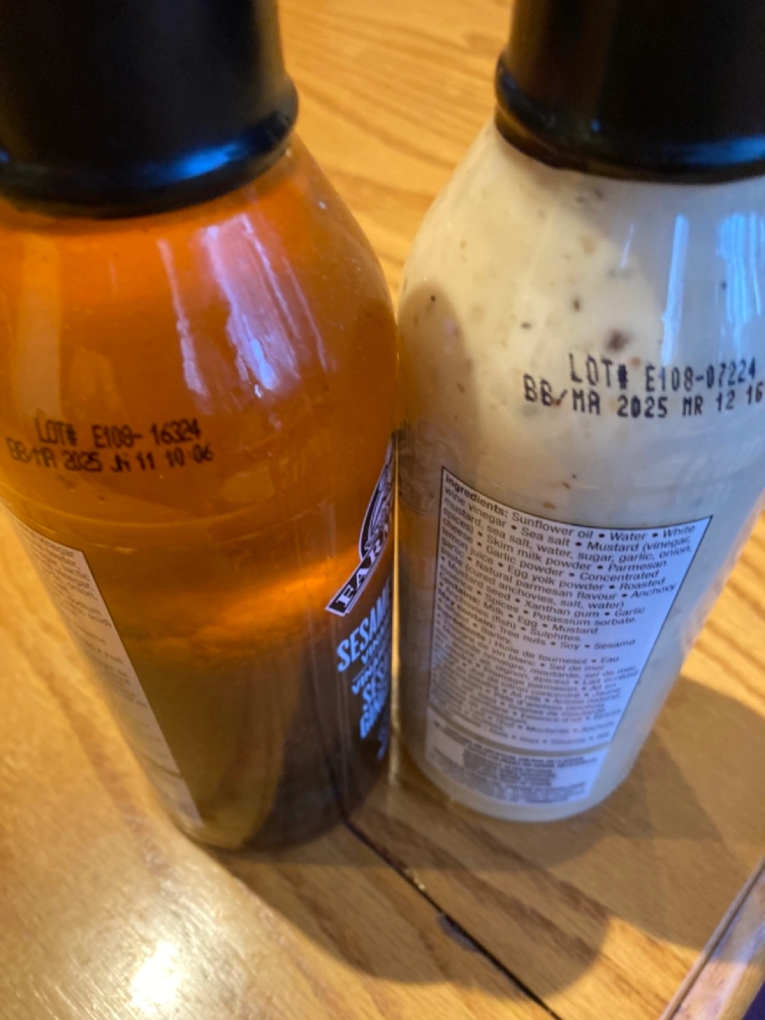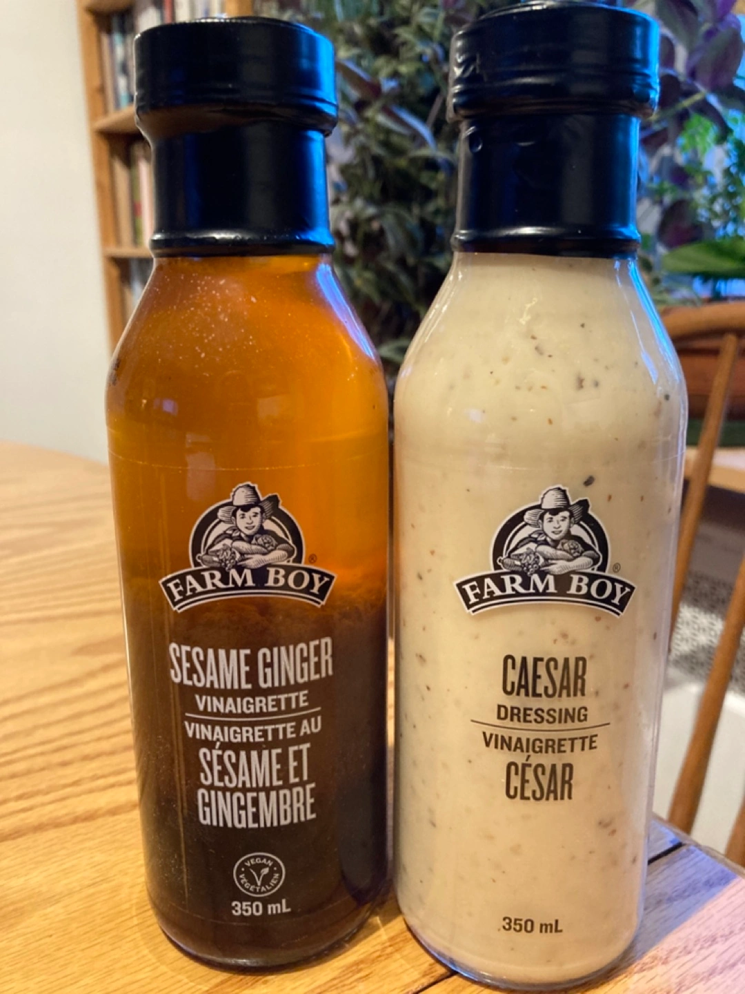 Two 350 mL bottles of Farm Boy dressings. One sesame ginger vinaigrette, one Caesar dressing. Both unopened. Best before dates in images; May 2025. I won’t get around to using these. Price is for both bottles.