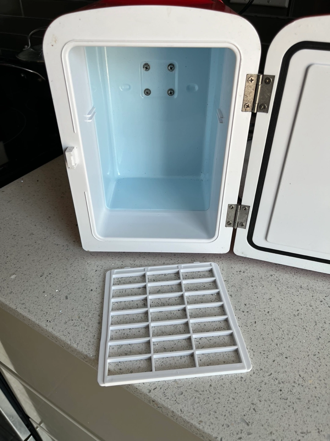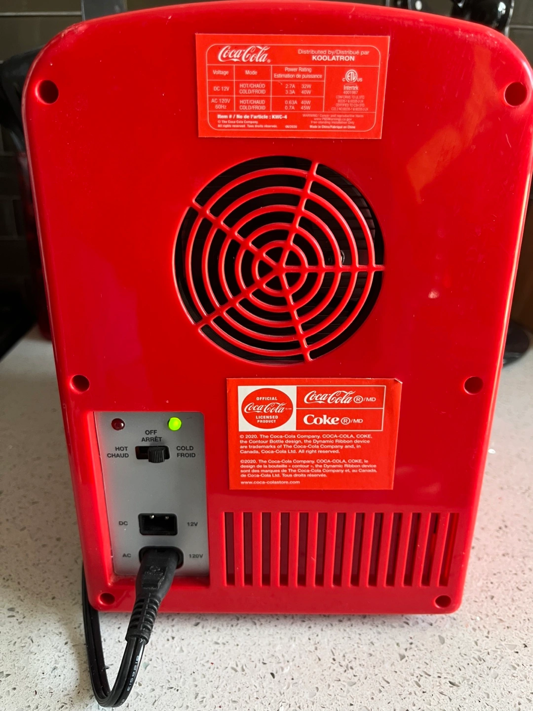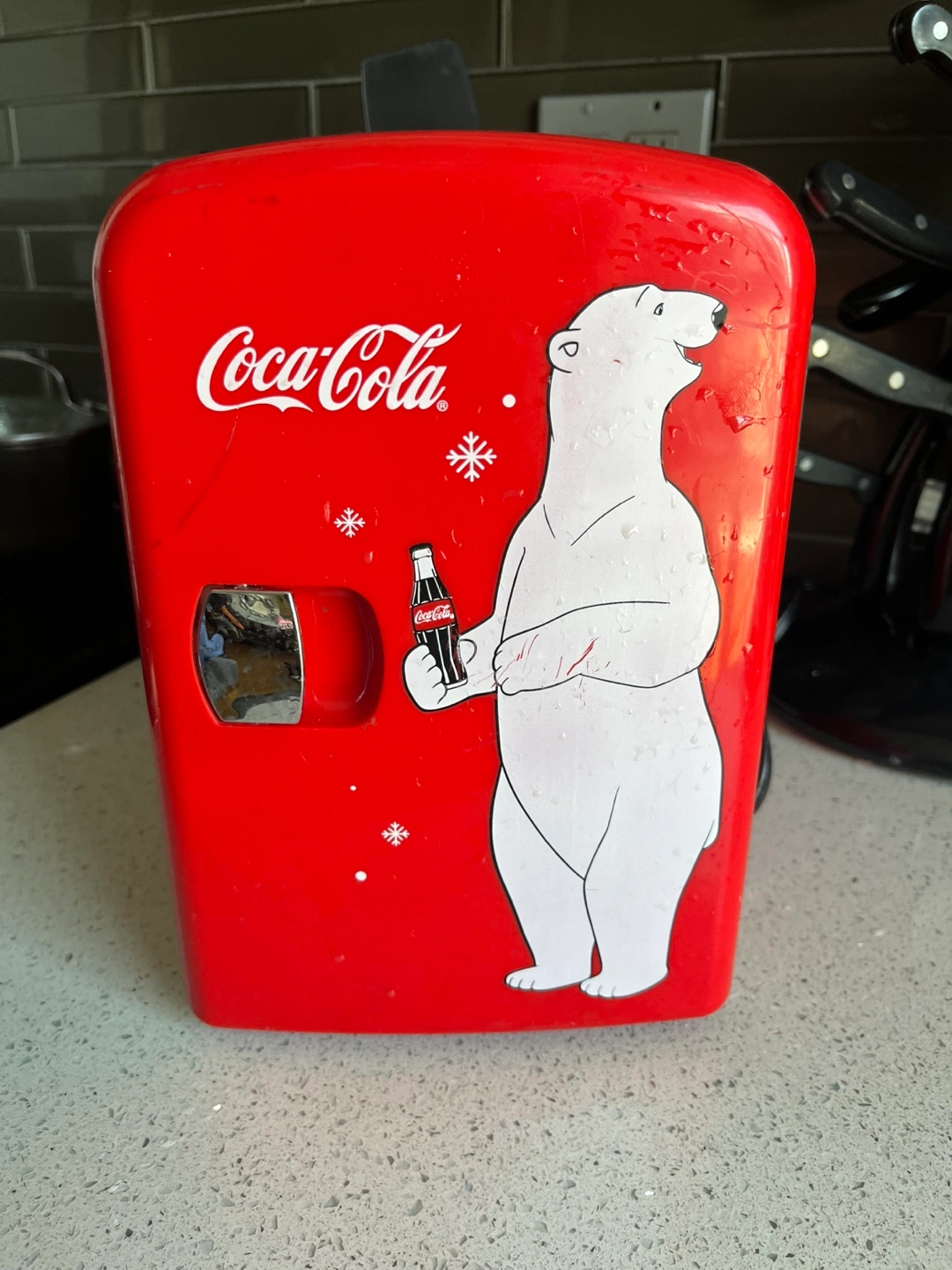 Small red Coca-Cola branded mini fridge. Features a polar bear design. Includes a removable shelf. Good for drinks or small items. You can pick up by Carlton and Jarvis area