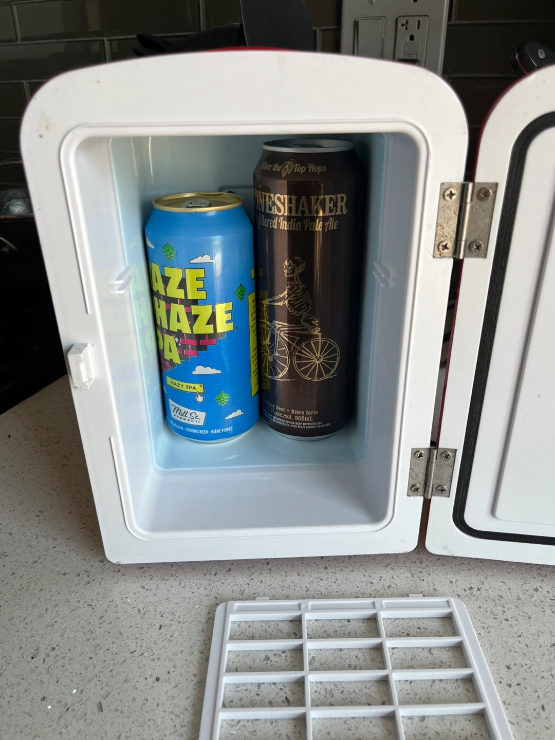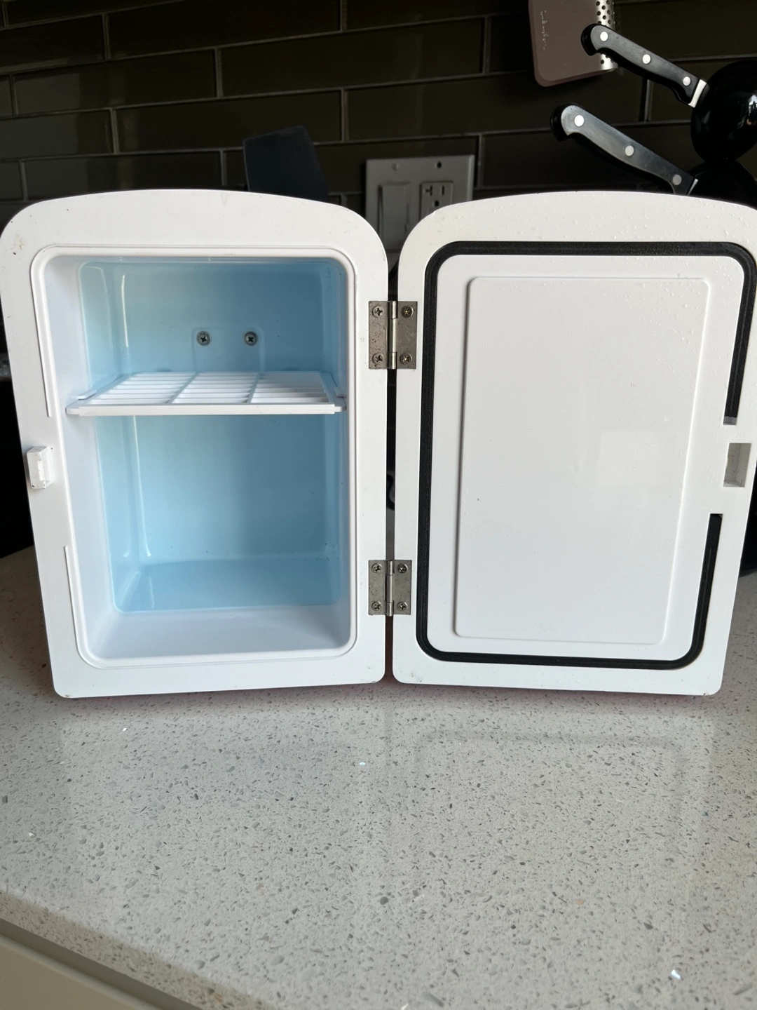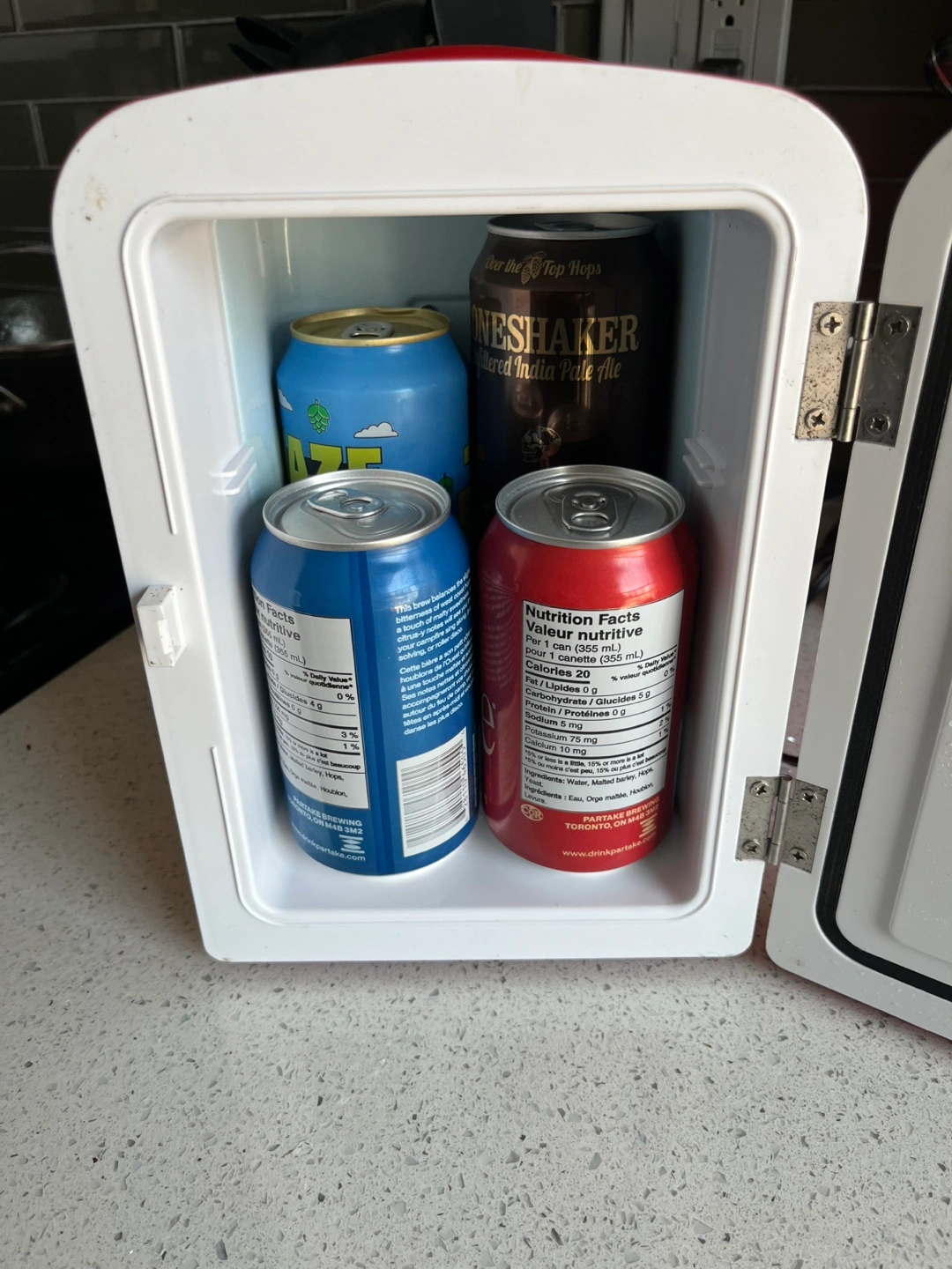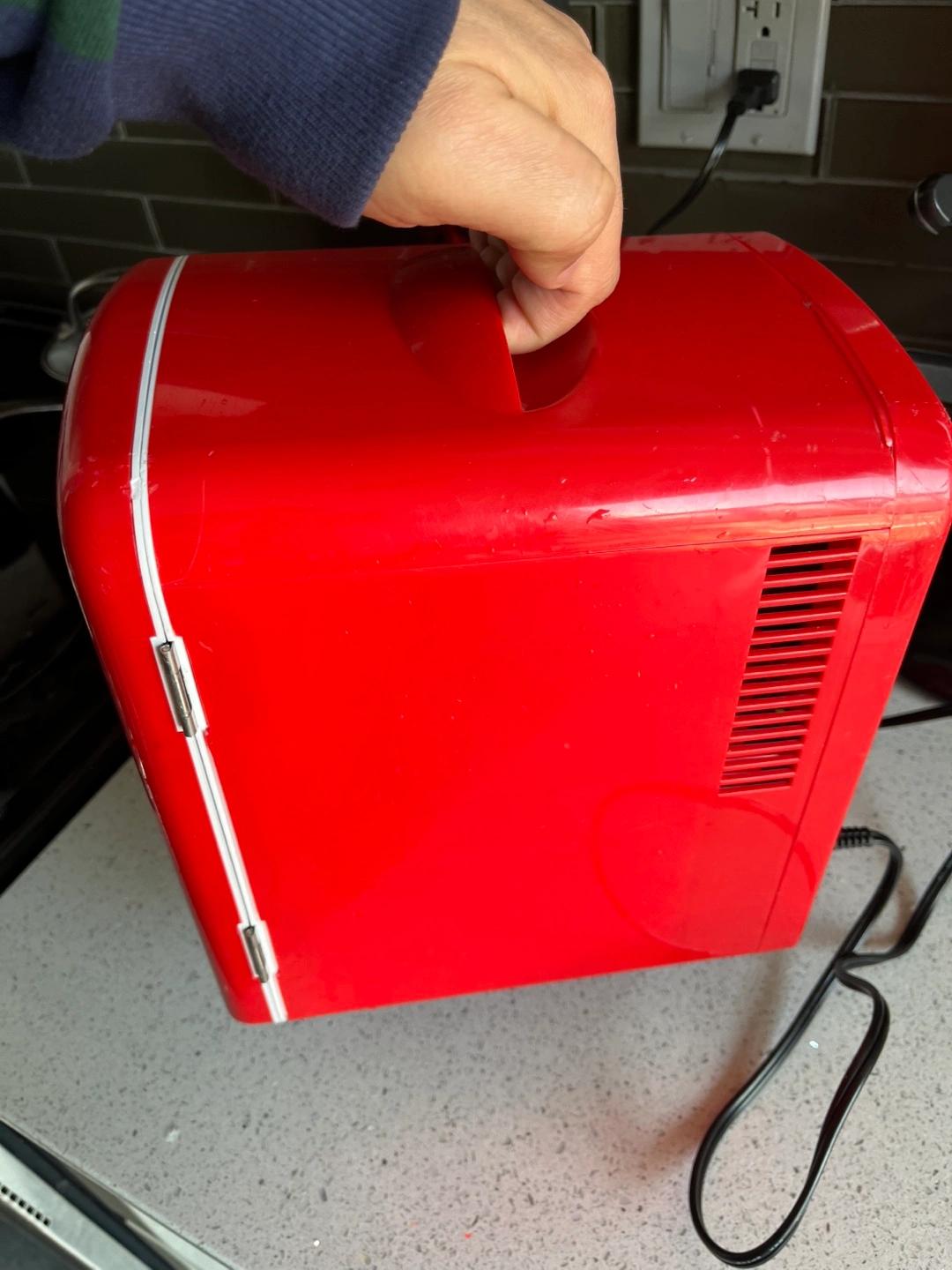 Small red Coca-Cola branded mini fridge. Features a polar bear design. Includes a removable shelf. Good for drinks or small items. You can pick up by Carlton and Jarvis area