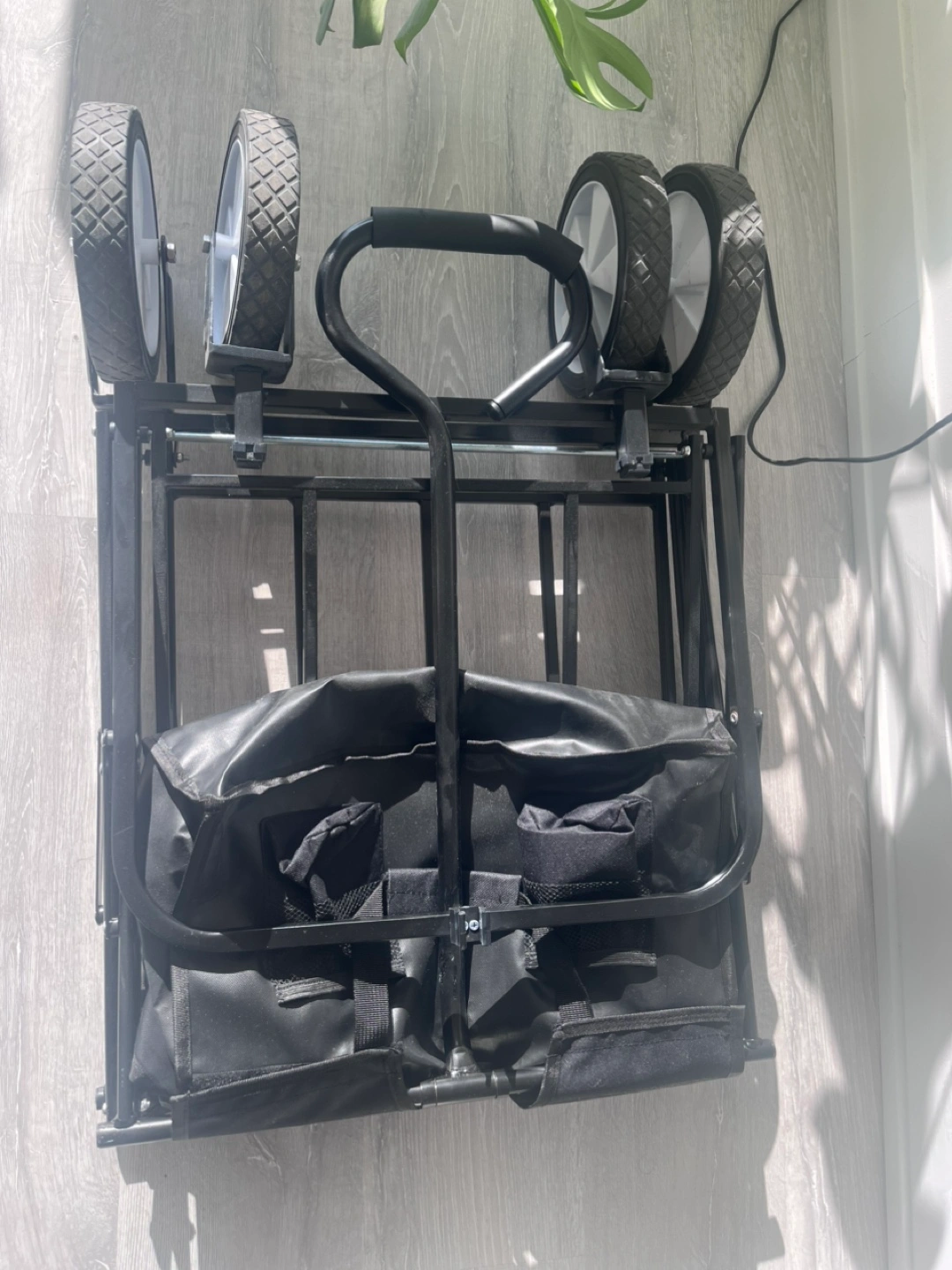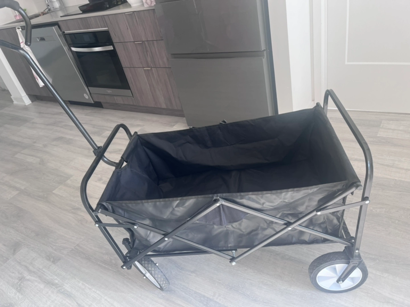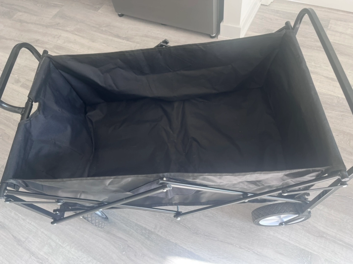 Black collapsible wagon. Features a fabric liner and pull handle. Great for hauling groceries, camping gear, or other items. Folds flat for storage.