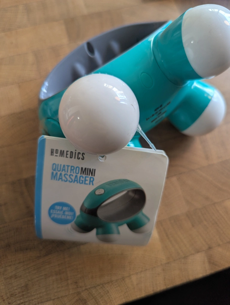 Handheld personal massager. Teal and grey. Four massage heads. Compact and portable. Great for travel.