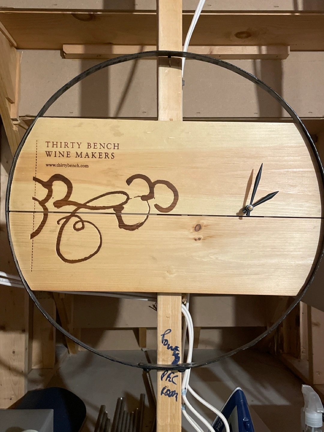 Unique wall clock. Wine barrel stave construction. Simple clock face. Thirty Bench Wine Makers branding.
