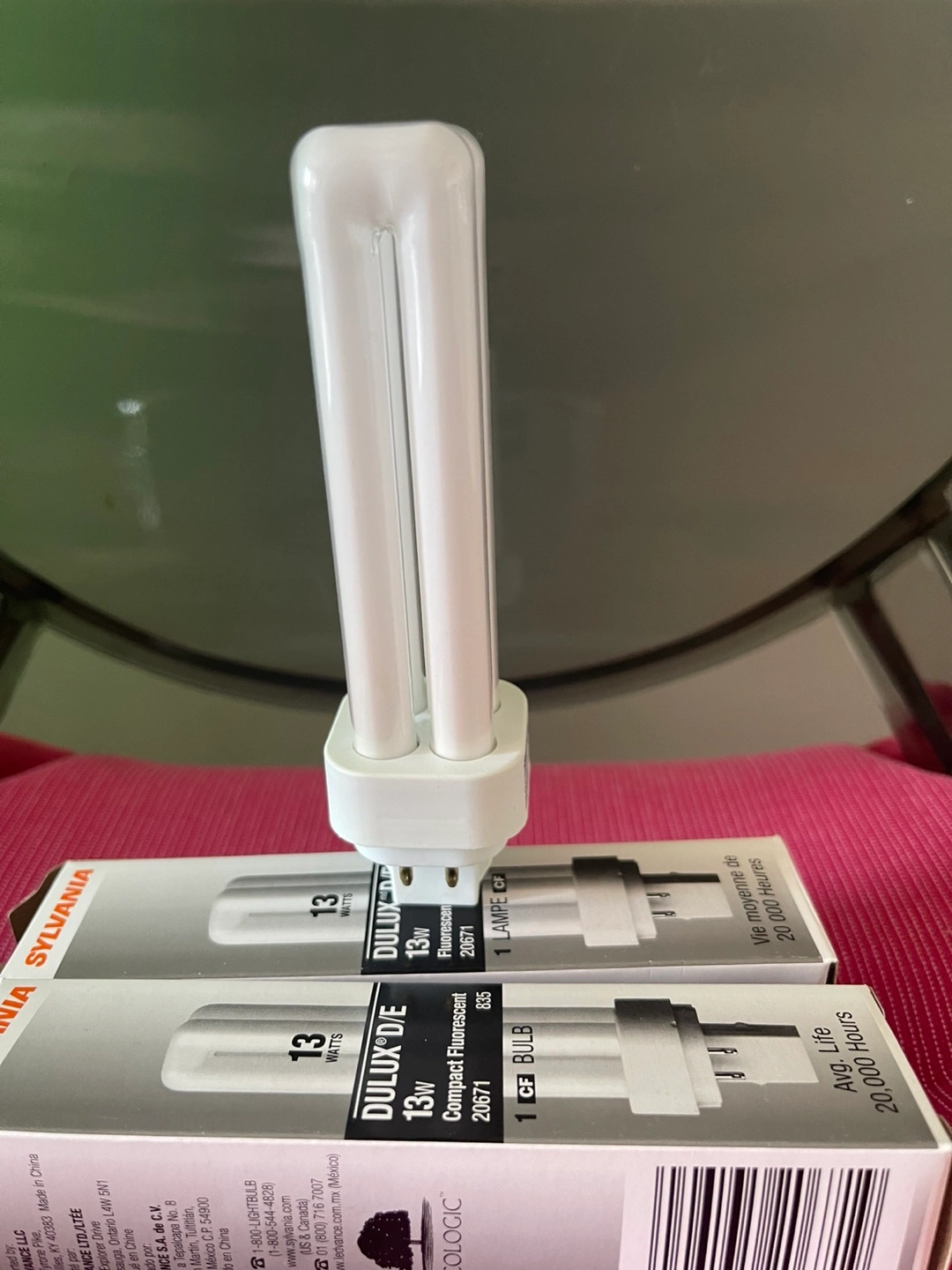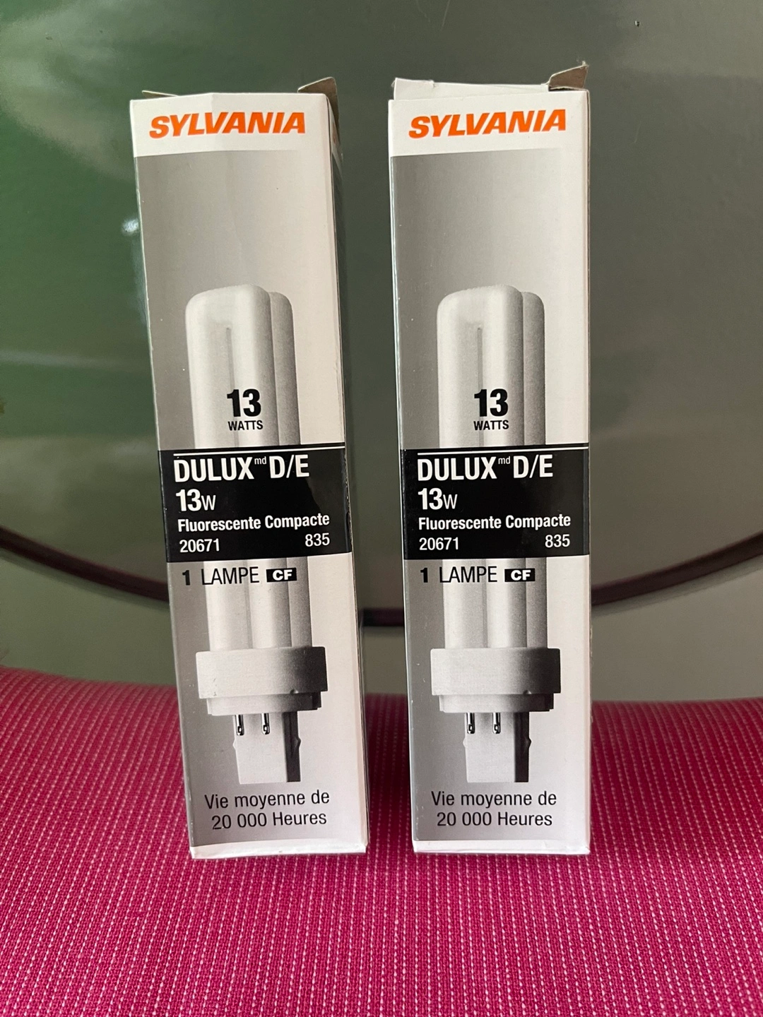 Pair of brand new Sylvania Dulux D/E 13W compact fluorescent light bulbs. 20,000 hour average life. In original packaging.