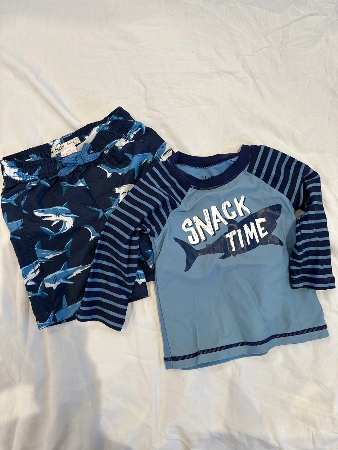 12-18 Adorable two-piece swimsuit set. Features a rash guard with shark graphic and striped sleeves. Matching swim trunks with shark print. Perfect for summer fun.