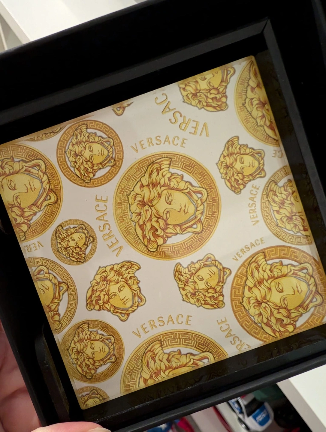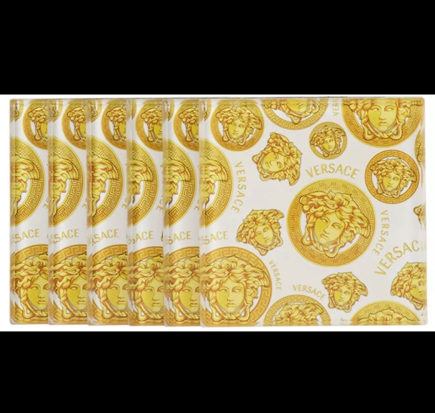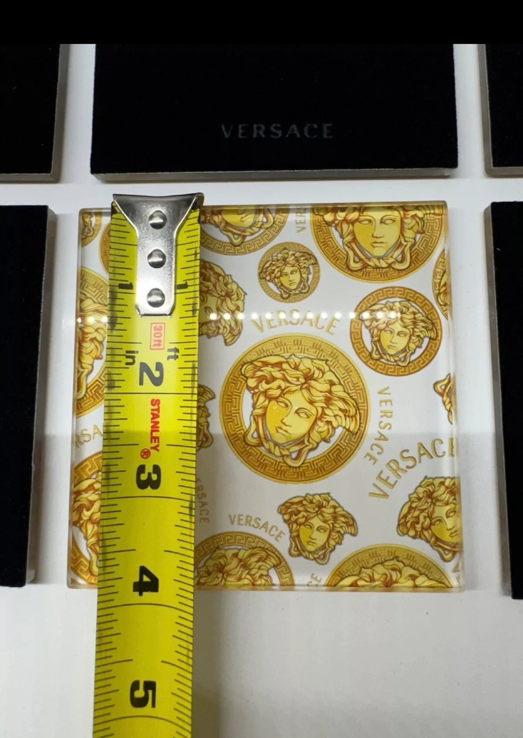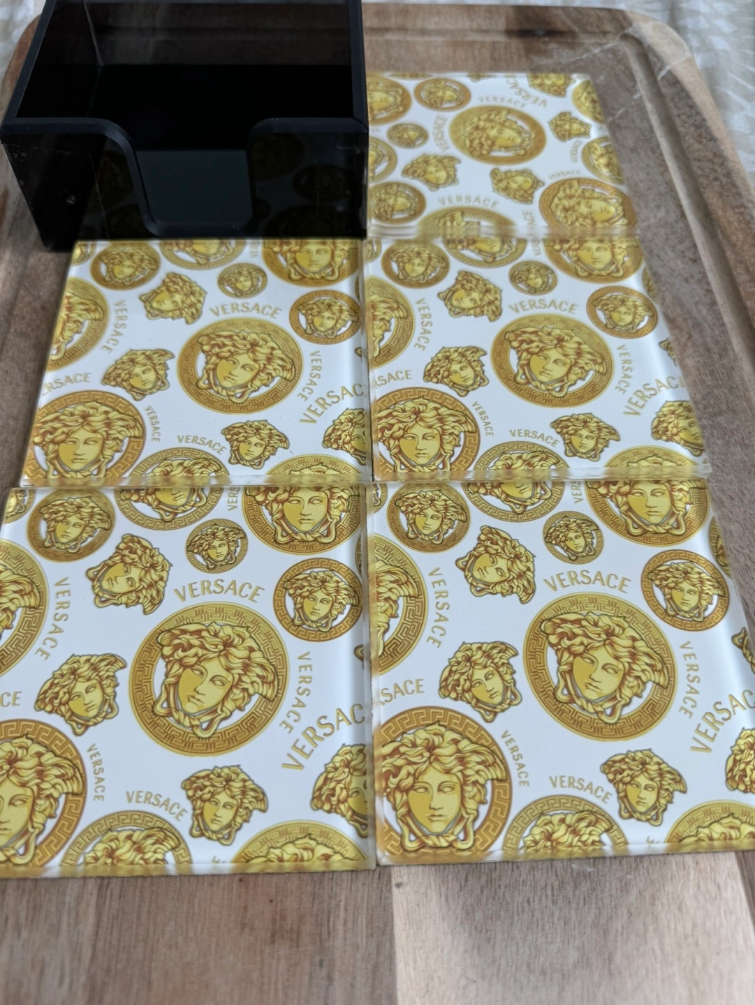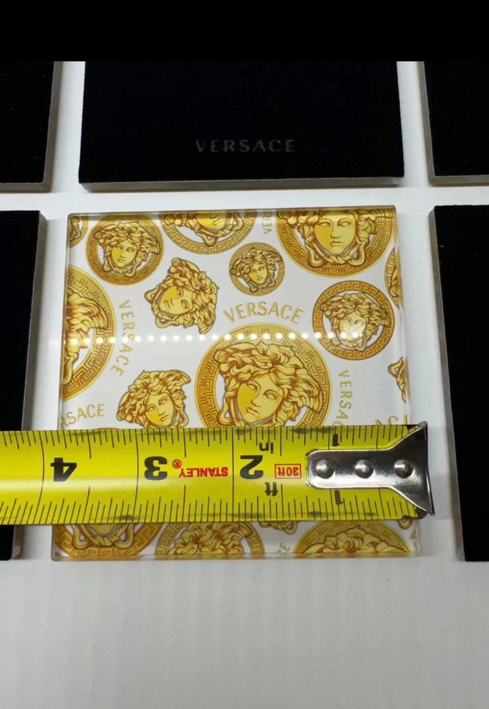 5 square glass coasters. Features a repeating Versace Medusa head pattern in gold on a white background. Come with a black holder. Approximately 4 inches square. New in box The box is little damaged