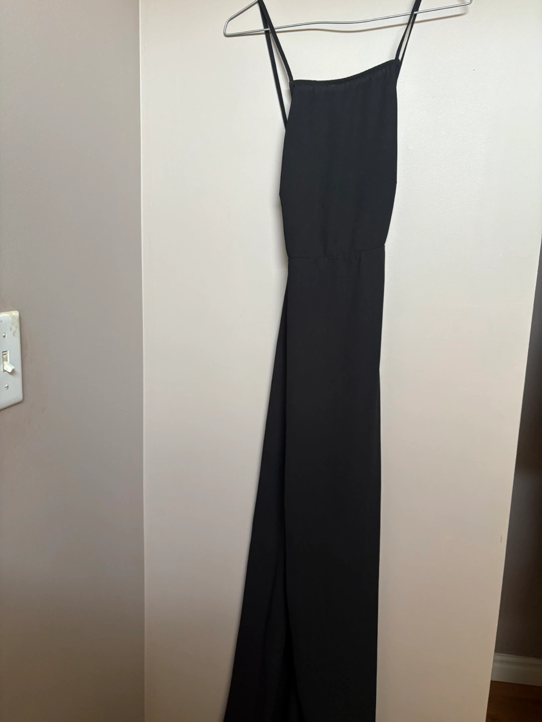 Long black maxi dress. Halter neck. Open back. Lightweight material. Great for summer. High slit on one leg.