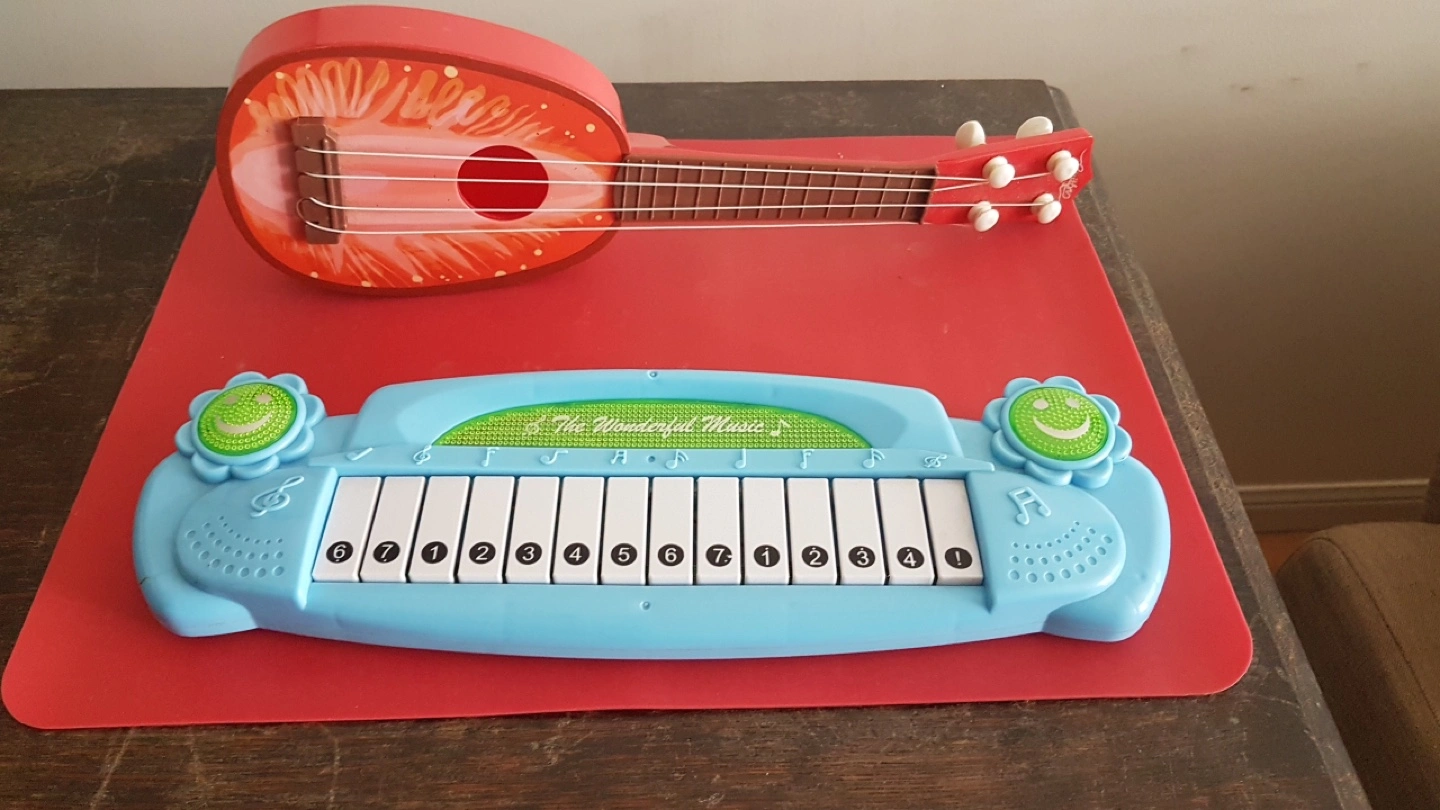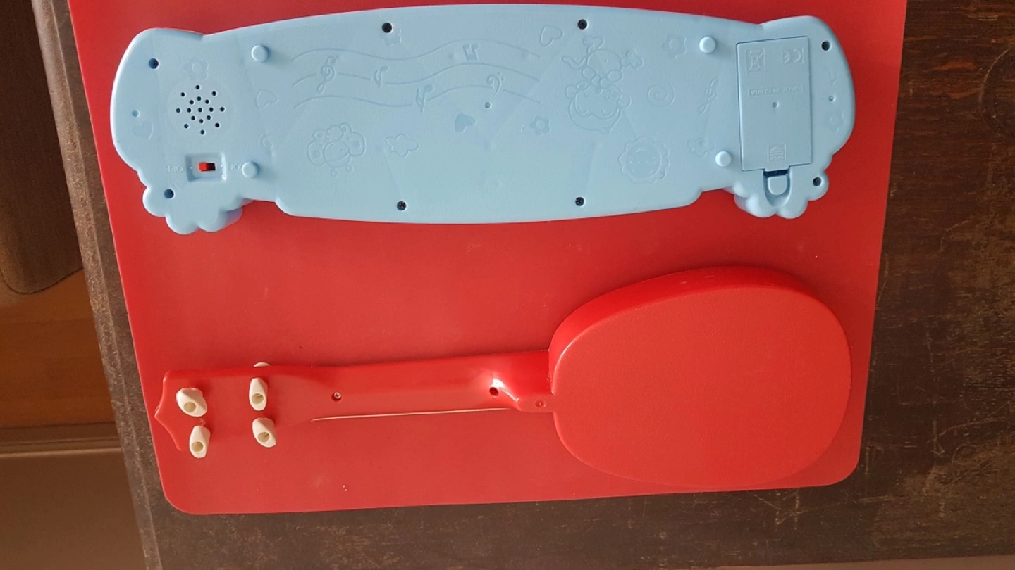 Red toy guitar blue +Blue portable toy keyboard with flashlight for children or your talented fur babies. Good condition.