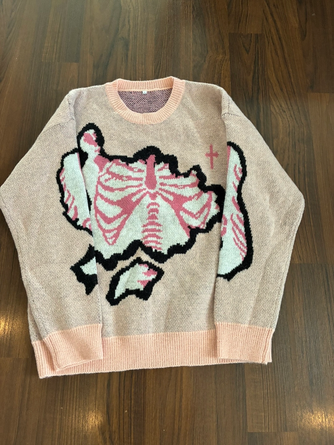 Women's pink knit sweater. Features a ribcage graphic. Crew neck, long sleeves. Lightweight knit.